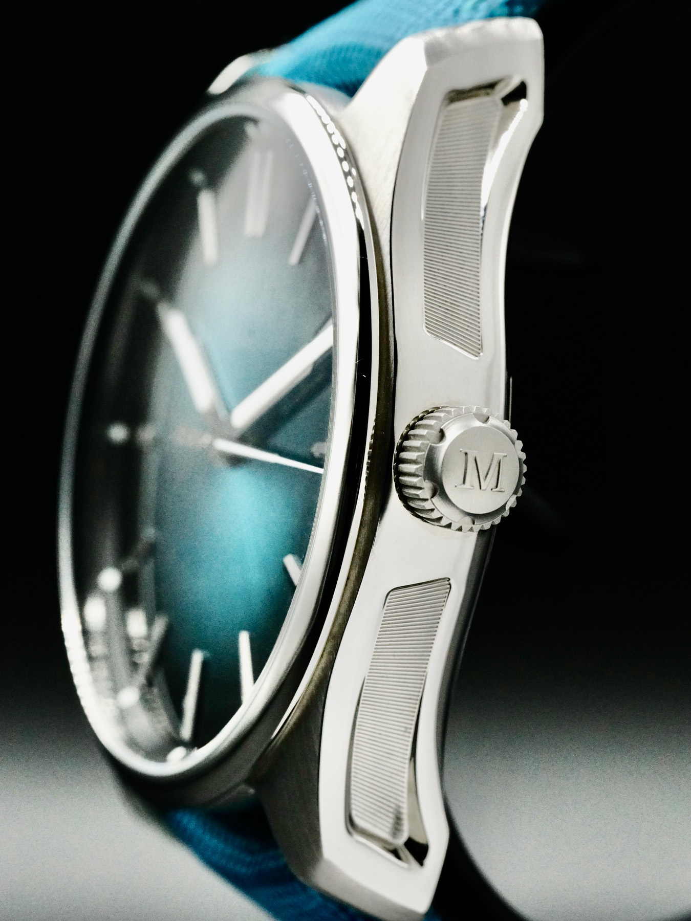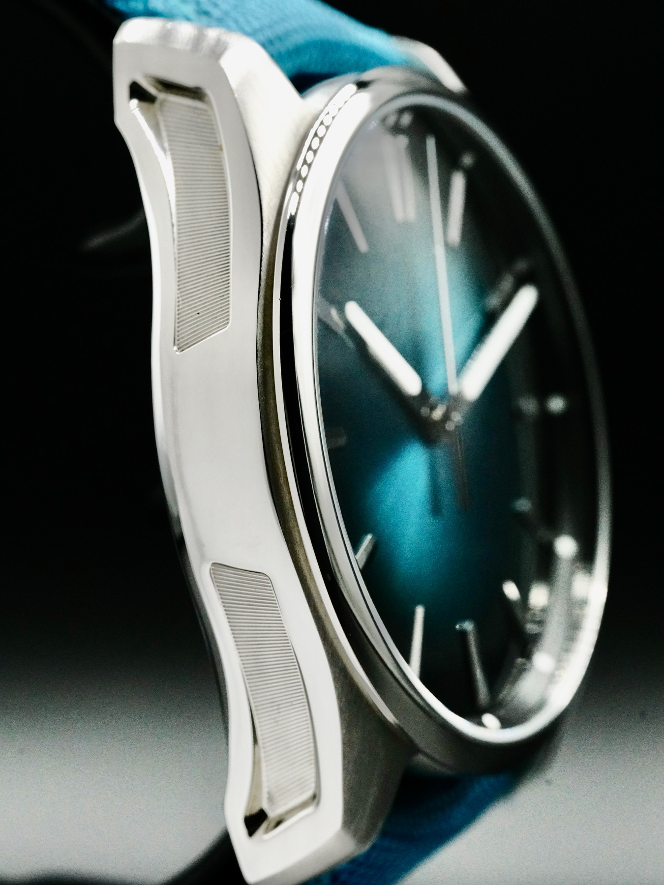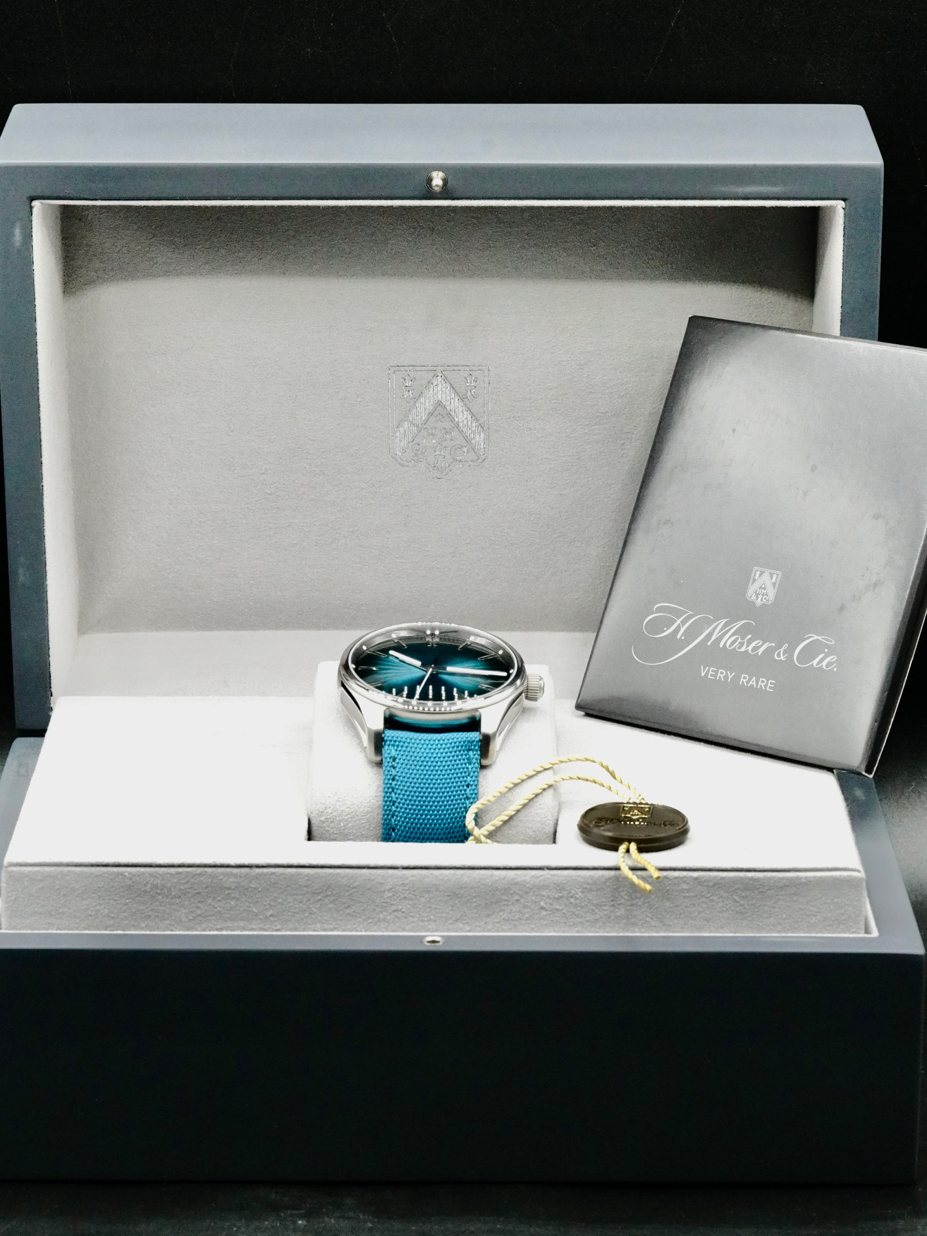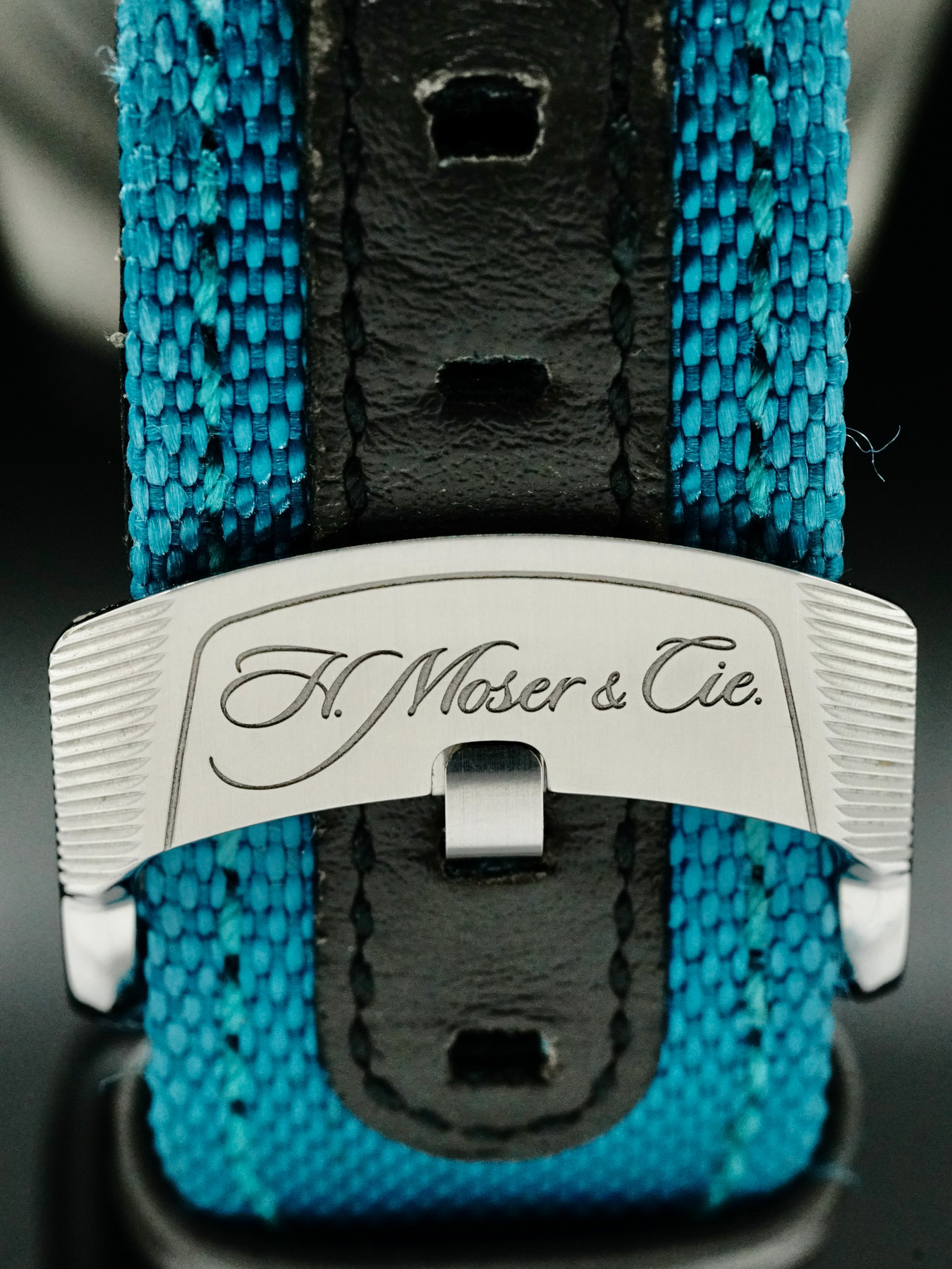 This H. Moser & Cie. Pioneer Centre Seconds Mega Cool features a 42mm stainless steel case with a display case back on a teal textile strap. This watch also sports a blue lagoon fumé dial with luminous hands and index dial markers covered by scratch resistant sapphire crystal.