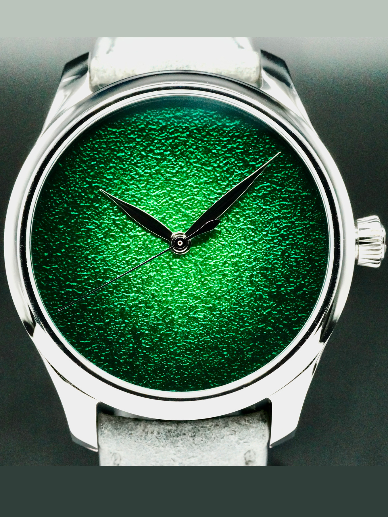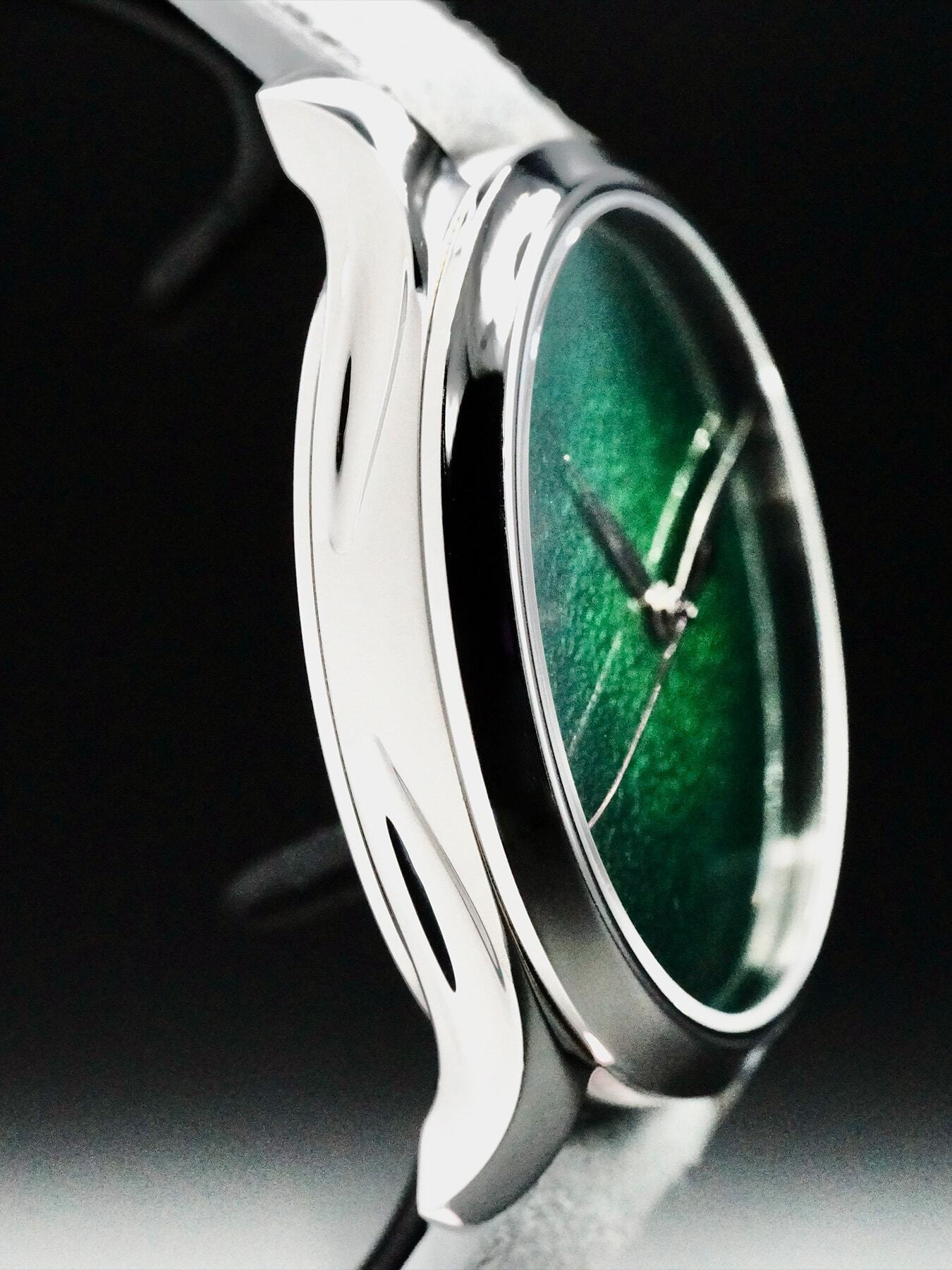 This H. Moser & Cie. Endeavour Centre Seconds Concept Lime Green features a 40mm stainless steel case with an exhibition case back on a grey leather strap. This watch also showcases a Grand Feu Enamel Green Fumé dial with leaf-shaped hands covered by scratch resistant sapphire crystal.