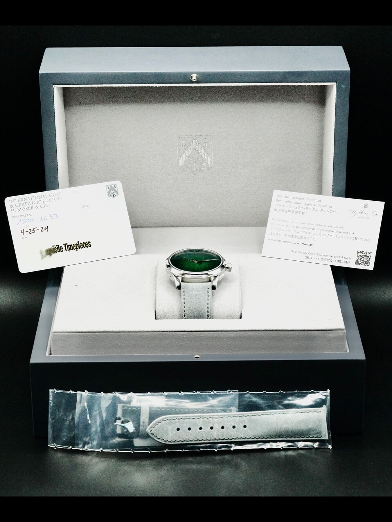 This H. Moser & Cie. Endeavour Centre Seconds Concept Lime Green 1200-1233 is in GREAT condition. This watch includes its original box, instructions, and warranty card dated for 2024. Extra grey leather strap. This watch has been fully authenticated and certified by Exquisite Timepieces.