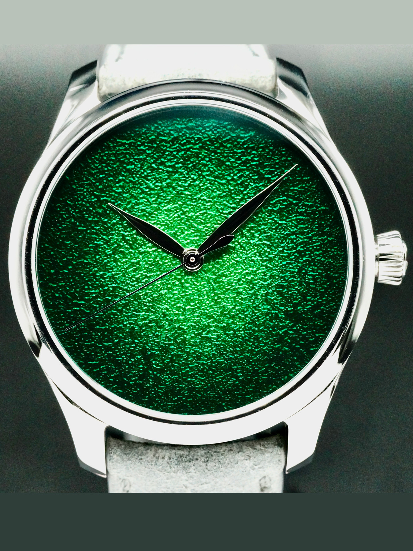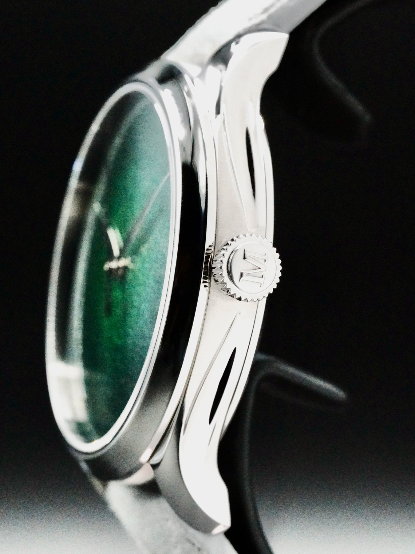 This watch features a 40mm stainless steel case on leather strap. This watch also sports a green dial. Powered by a mechanical automatic movement. Water resistance up to 30 meters.