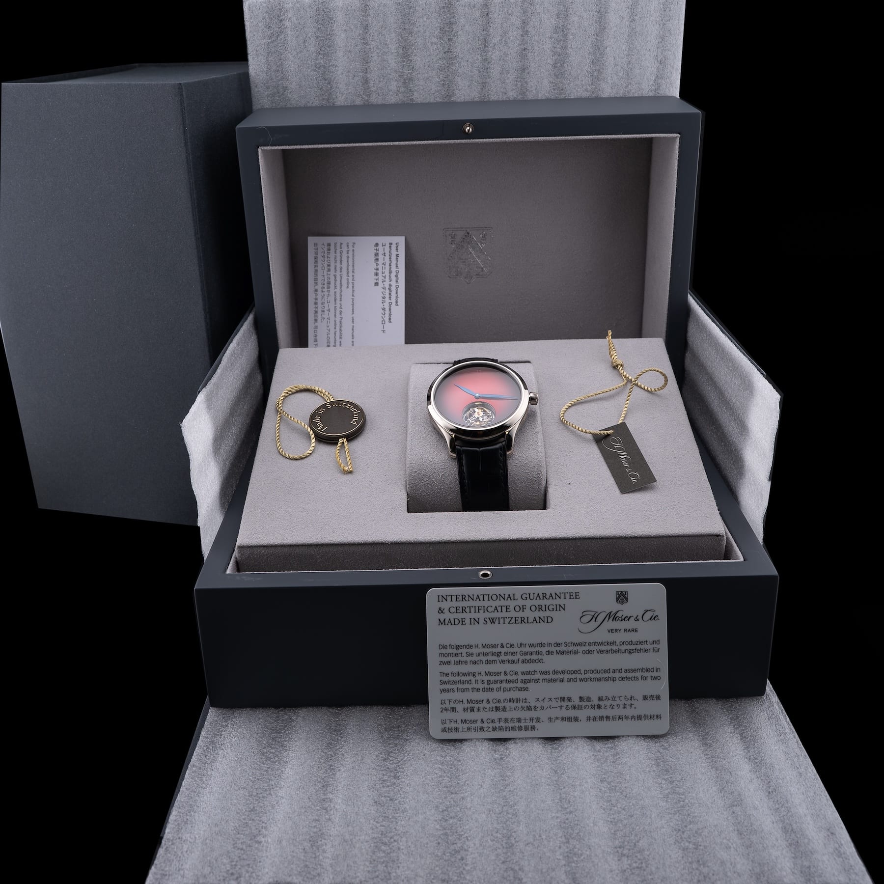 This H. Moser & Cie 1804-0205 Endeavour Tourbillon Limited Edition Red Dial is in GREAT condition. This watch includes its Original Box, Original Papers and Warranty Card Dated 3/10/23. This watch has been fully authenticated and certified by Exquisite Timepieces.