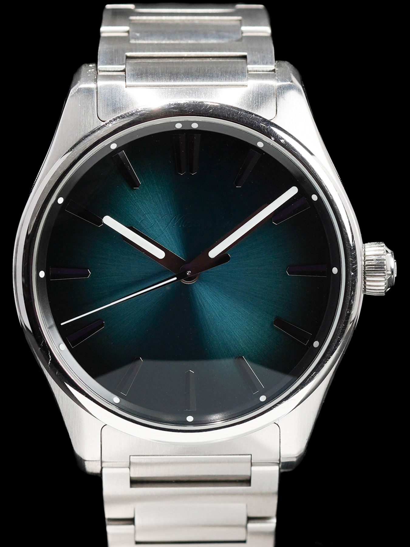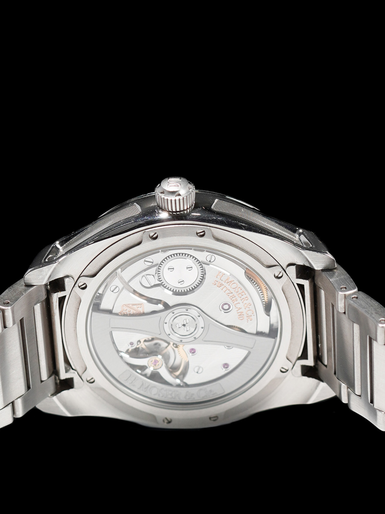 This H. Moser & Cie. 3200-1214 Pioneer Centre Seconds Mega Cool is in GOOD condition. This watch includes its Original Box and Original Papers. No warranty card. Extra strap and bracelet link. This watch has been fully authenticated and certified by Exquisite Timepieces.