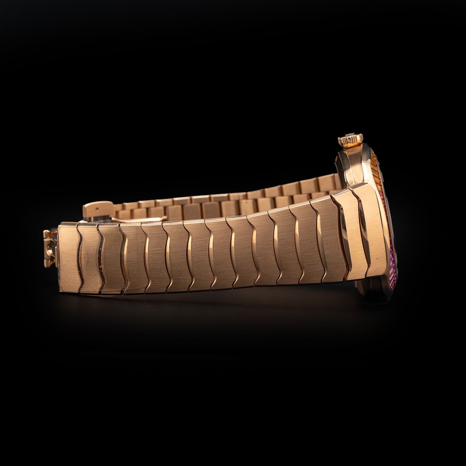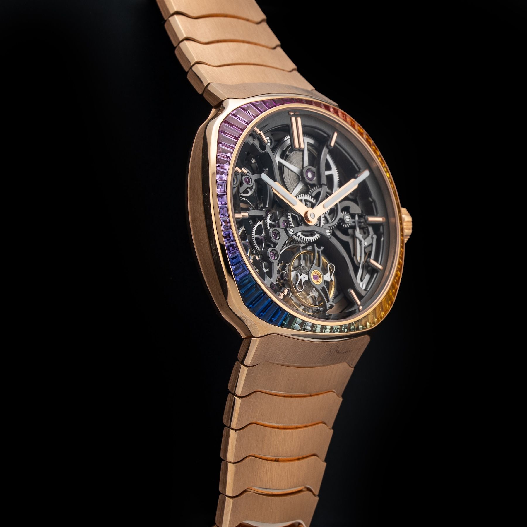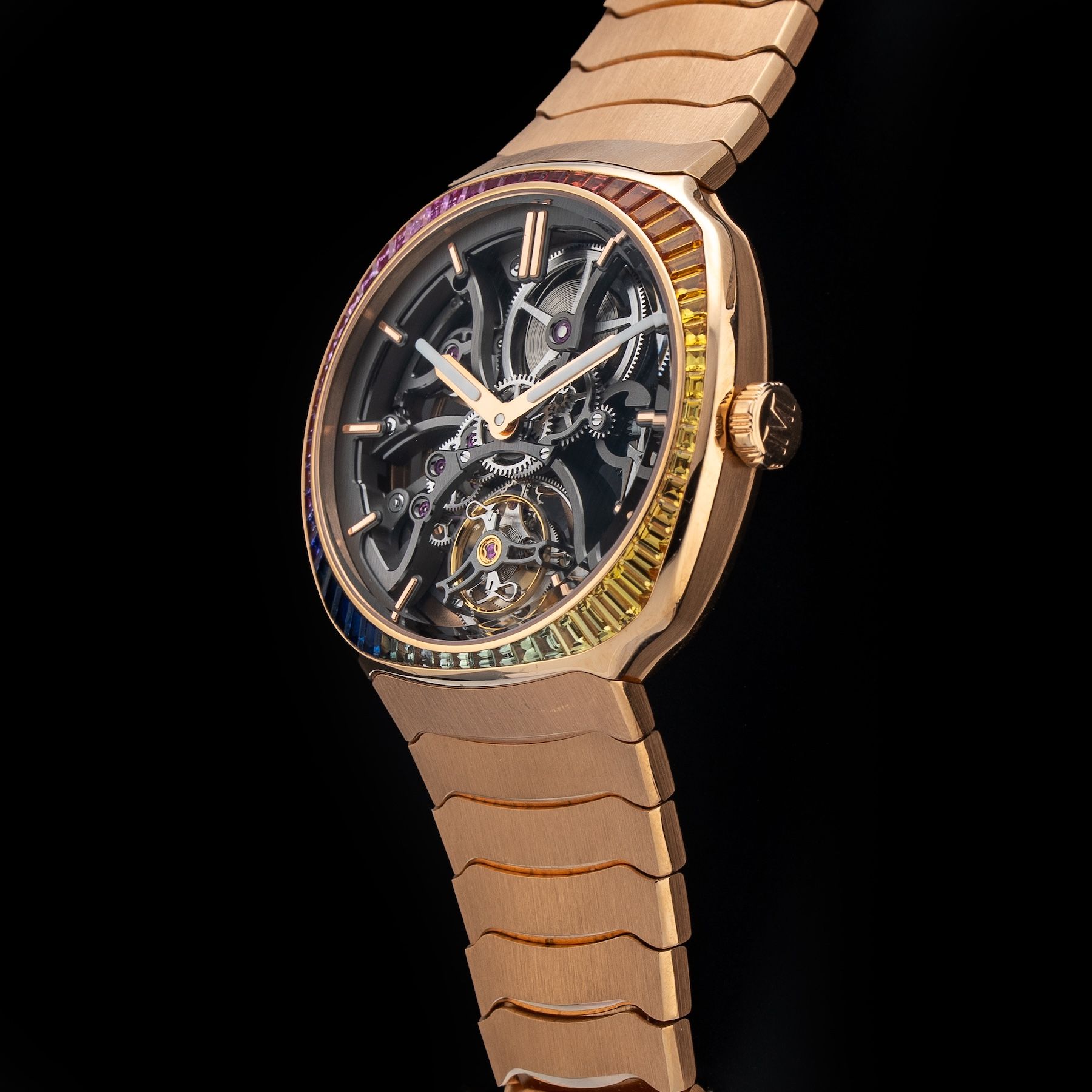 This watch features a 40mm 5N red gold case on 5N red gold bracelet. This watch also sports a skeleton / open dial. Powered by a tourbillon automatic movement. Water resistance up to 120 meters.