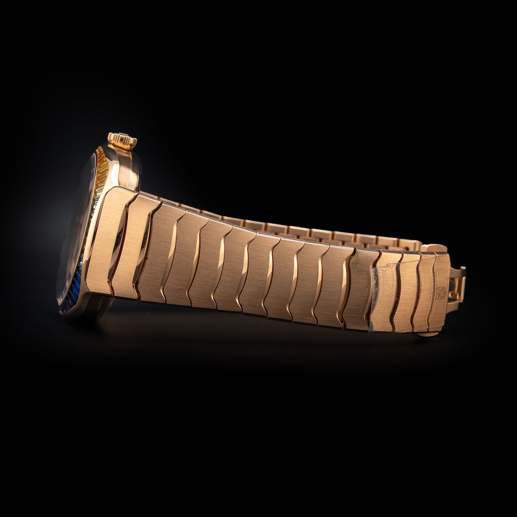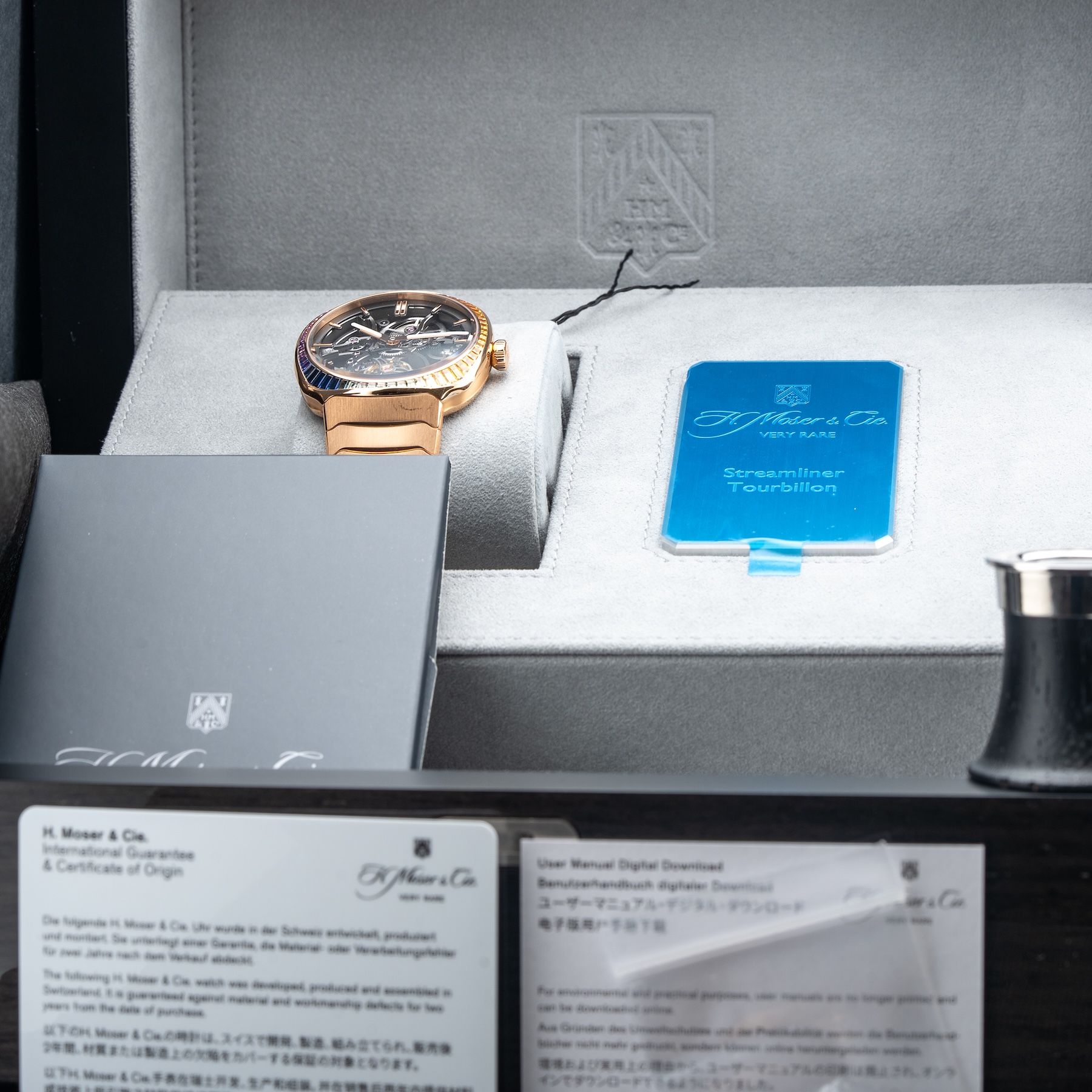 This H. Moser & Cie. 6814-0401 Streamliner Tourbillon Rose Gold Skeleton Rainbow is in GREAT condition. This watch includes its Original Box, Original Papers and Warranty Card Dated 04/14/2025. This watch has been fully authenticated and certified by Exquisite Timepieces.