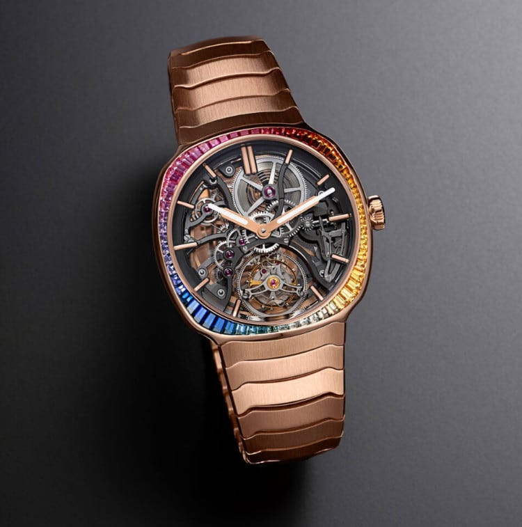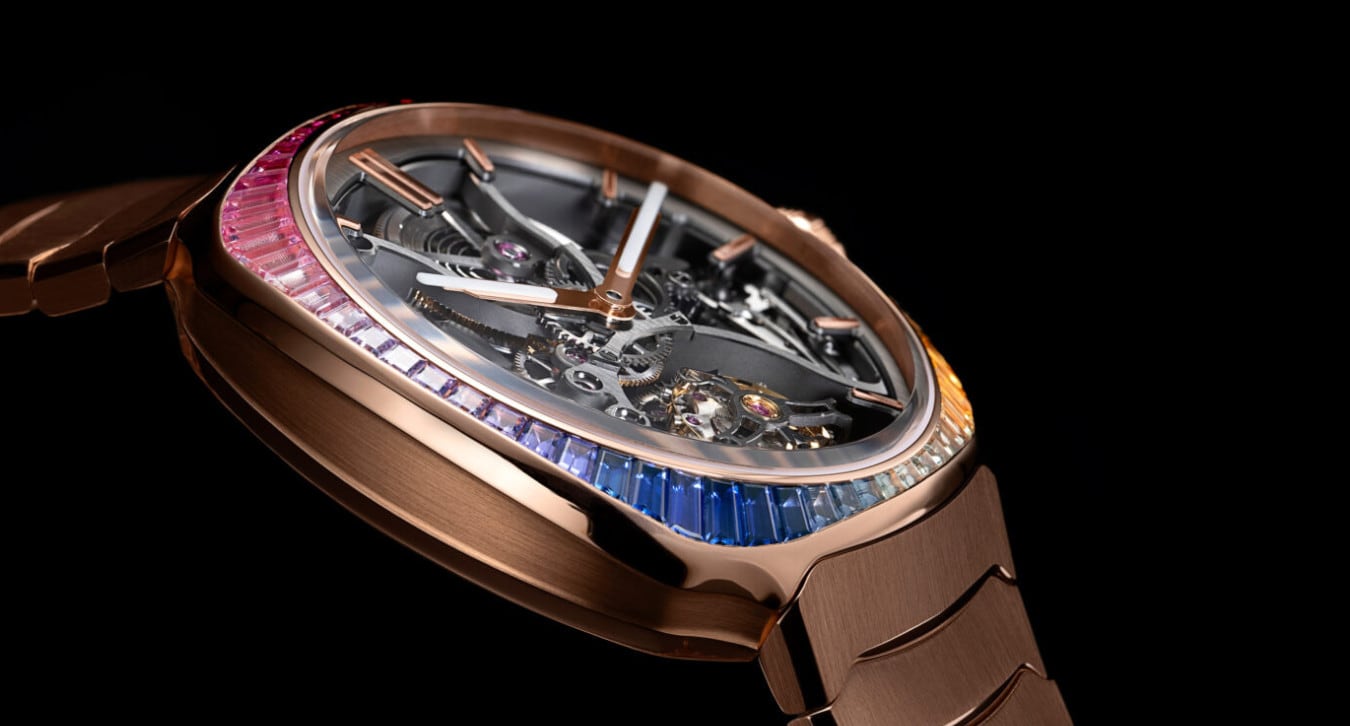 Invisibly set sapphire gemstones create a dazzling rainbow around a flying tourbillon and openworked movement.