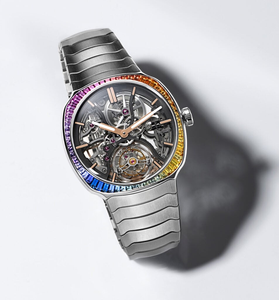 Invisibly set sapphire gemstones create a dazzling rainbow around a flying tourbillon and openworked movement.