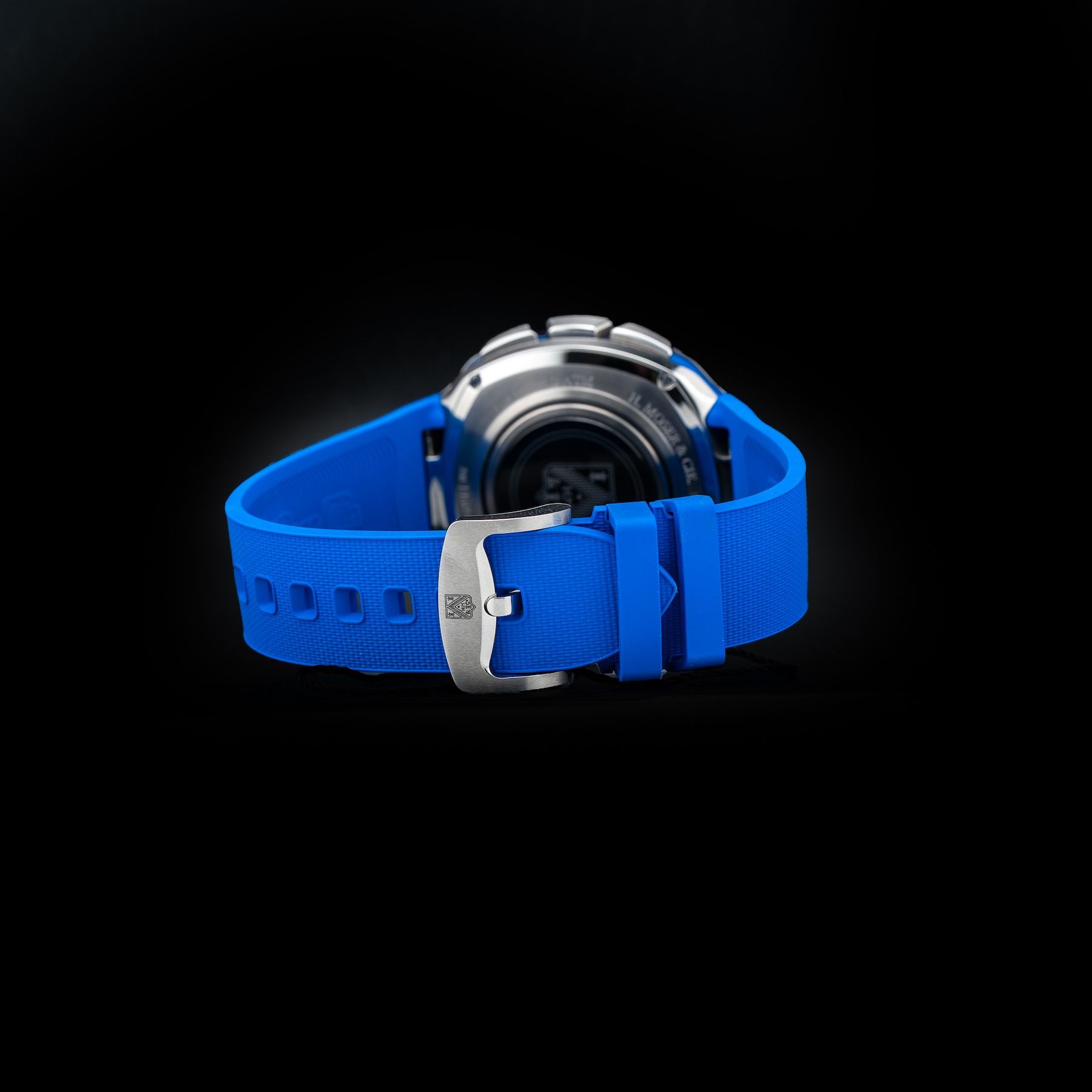 This watch features a 42.6mm stainless steel case on rubber strap. This watch also sports a black and funky blue fumé sub-dial. Powered by a connected movement. Water resistance up to 120 meters.