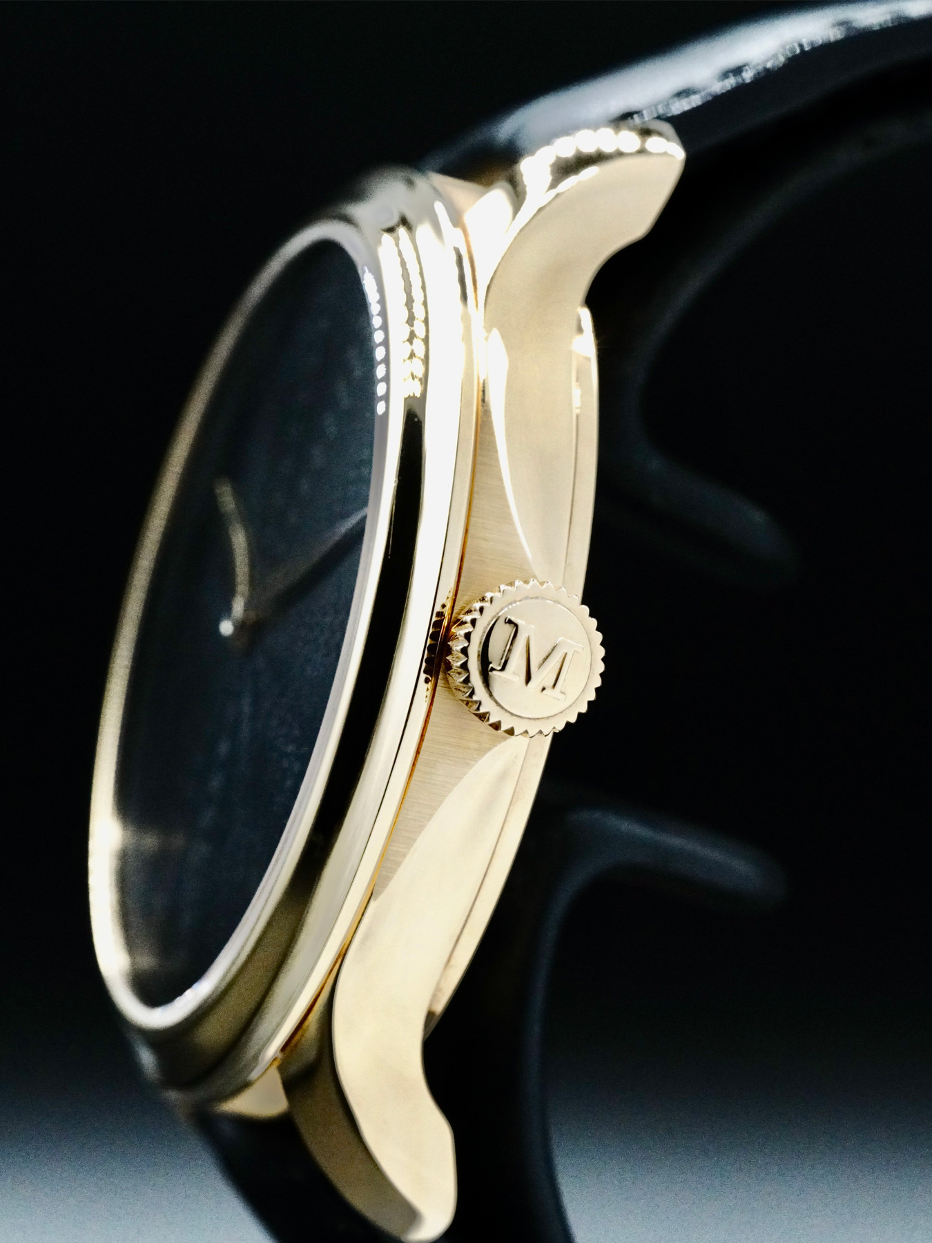 - This timepiece features a 38mm gold case paired with a high quality leather strap. It showcases a distinctive black dial and is powered by a precise manual winding movement. The watch is designed with a water resistance of up to 30m.