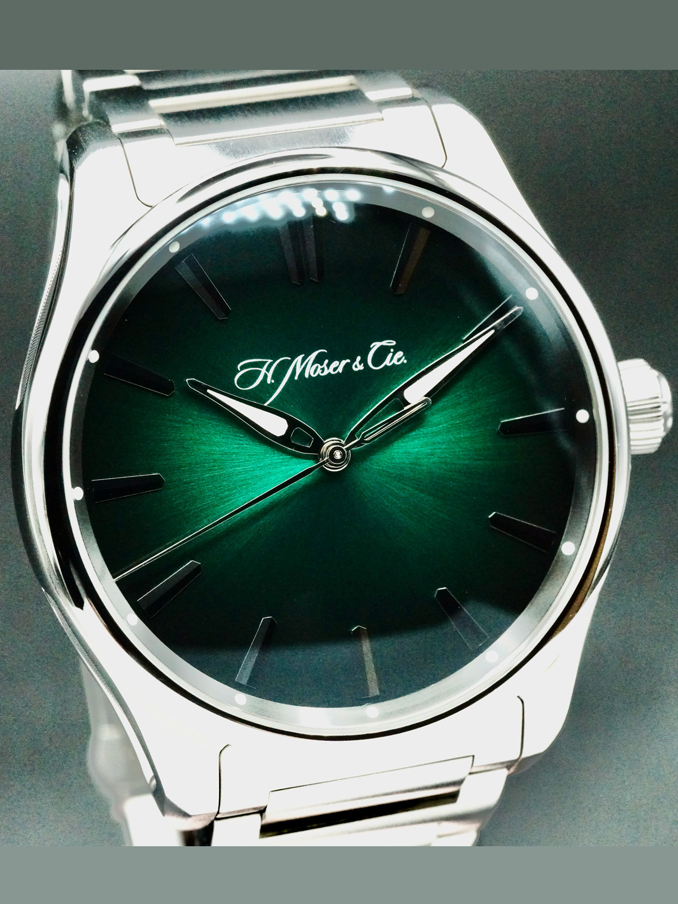 This H. Moser & Cie. Pioneer Centre Seconds features a 42.8mm stainless steel case with a display case back on a stainless steel bracelet. This watch also sports a cosmic green fumé dial with luminous hands and index dial markers covered by scratch resistant sapphire crystal.