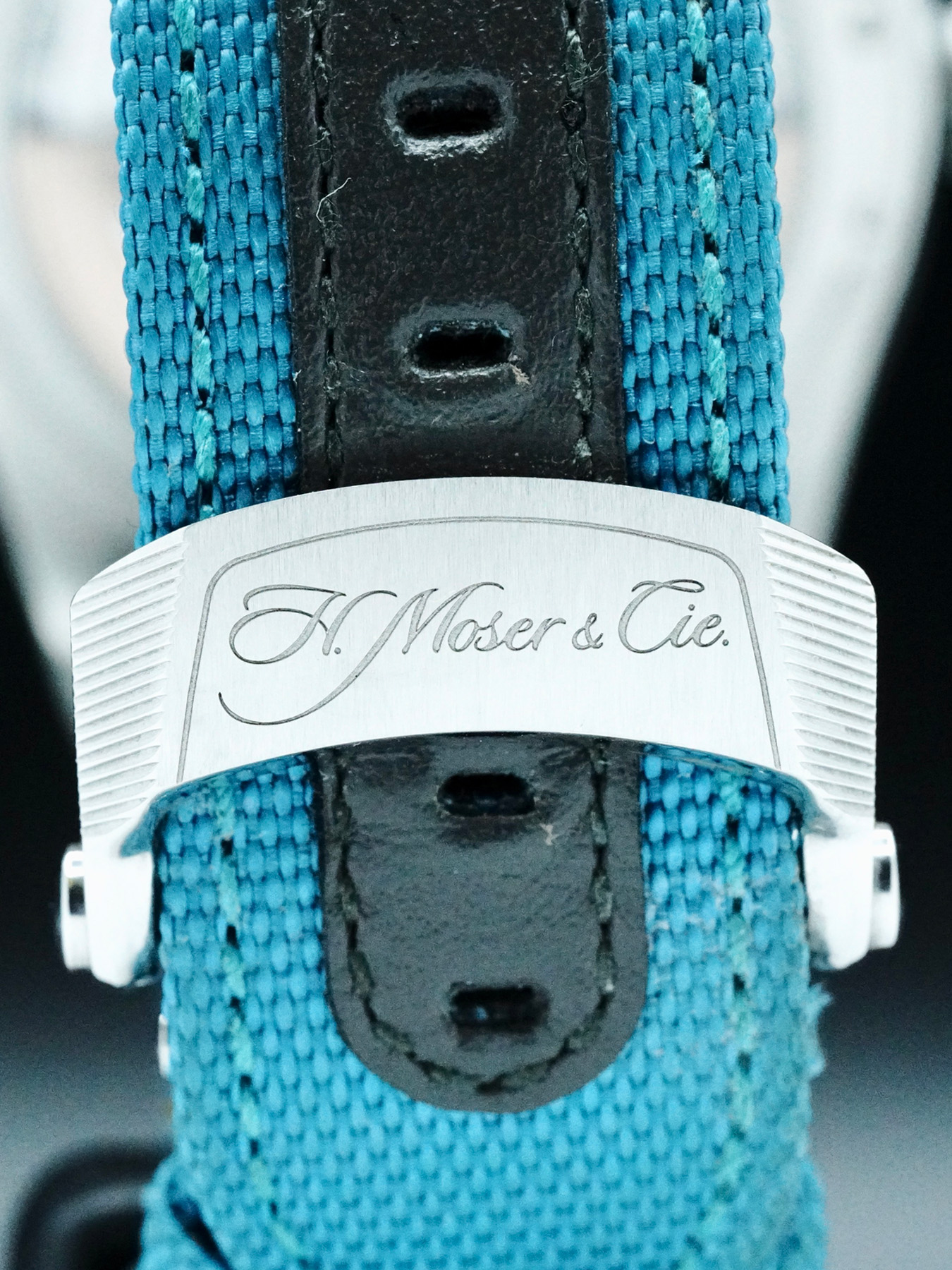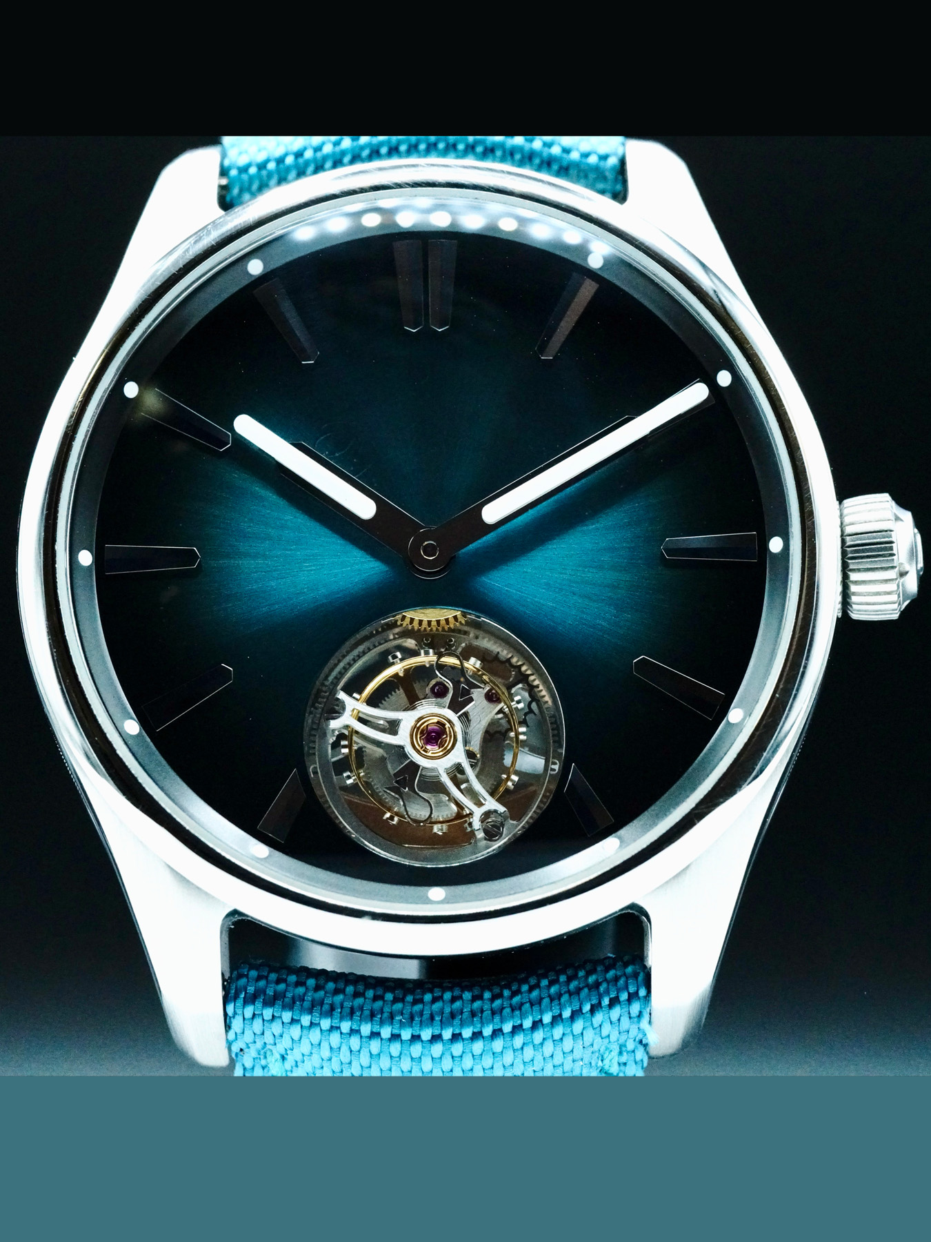 This H. Moser & Cie. Pioneer Tourbillon features a 42.8mm stainless steel case with an exhibition case back on a teal textile strap. This watch also sports a blue lagoon fumé dial with luminous hands and index dial markers covered by scratch resistant sapphire crystal.