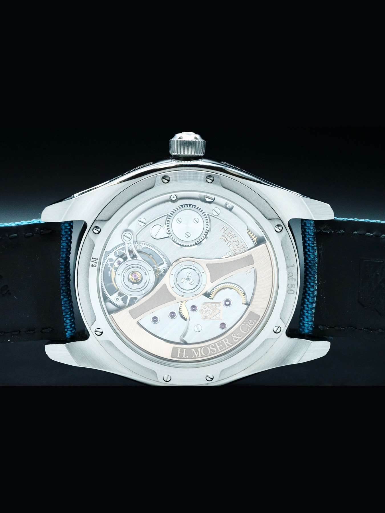 Automatic movement powered by H. Moser & Cie. Caliber HMC 804 with a power reserve of approximately 72 hours. Water resistance up to 120 meters.
