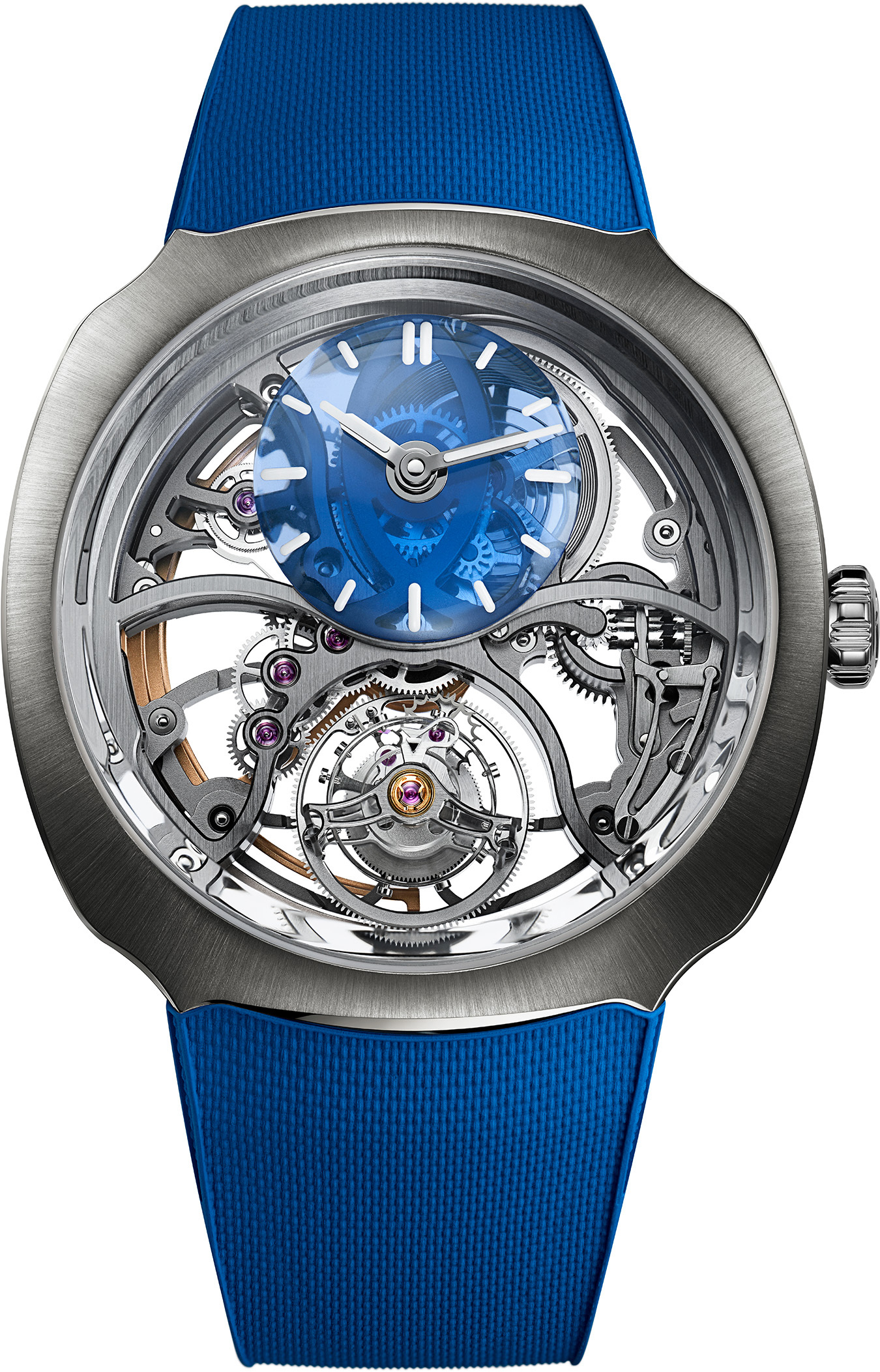 Small domed dial in bright blue synthetic spinel, skeletonized main dial