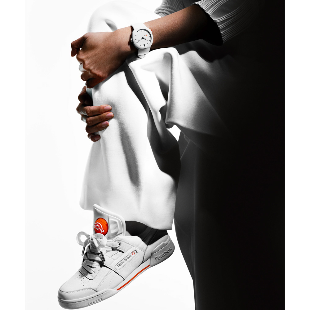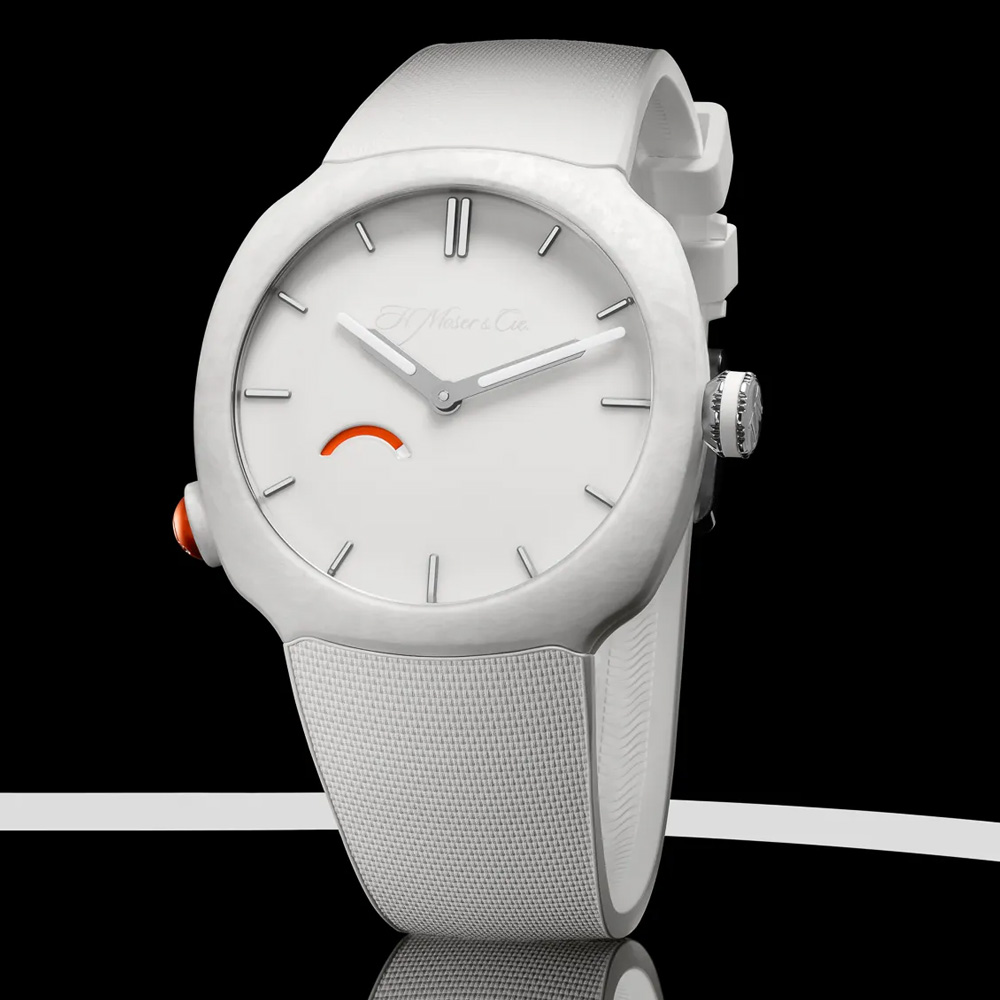 First introduced in 1989, the Reebok Pump redefined performance footwear with a bold idea: a shoe you could inflate for the perfect fit. Instantly recognisable by its signature orange pump button, it became a cultural icon, worn by elite athletes and embraced by street culture. More than a technical innovation, the Pump embodied a spirit of playful experimentation, where interaction was part of the experience. That same spirit now transcends disciplines, from the foot to the wrist. Each watch is paired with a limited edition of the new shoe, extending this iconic concept into a new dimension of interaction and design. Reimagined for watchmaking, the iconic Pump provides a unique way of power delivery. An anodised aluminium pusher transmits the energy of each press directly to the barrel spring, winding the movement while activating the power reserve indicator. Beneath the surface, an intricate mechanical choreography unfolds, visible through openworked bridges and a fully skeletonised rack. One press delivers more than an hour of power reserve. And once fully wound, the gesture remains, purely for the pleasure of interaction. The case is crafted from forged quartz fibre, a material rarely seen in watchmaking. Lighter than it looks yet remarkably resistant, it offers a unique aesthetic freedom, forming a matte surface with a distinctive moiré pattern: no two cases are alike. Inside, a titanium “sarcophagus” protects the movement, ensures water resistance to 10 ATM, and anchors the integrated rubber strap. A bold construction, engineered for both performance and comfort. At its heart beats the hand-wound manufacture calibre HMC 103, integrating the Pump system. Compact and precise, it delivers a minimum 74-hour power reserve and features an original Straumann® hairspring. Visible through the caseback, the movement reveals a refined architecture adapted to this unconventional winding mechanism. Technical ingenuity, driven by playful interaction.H. Moser & Cie.