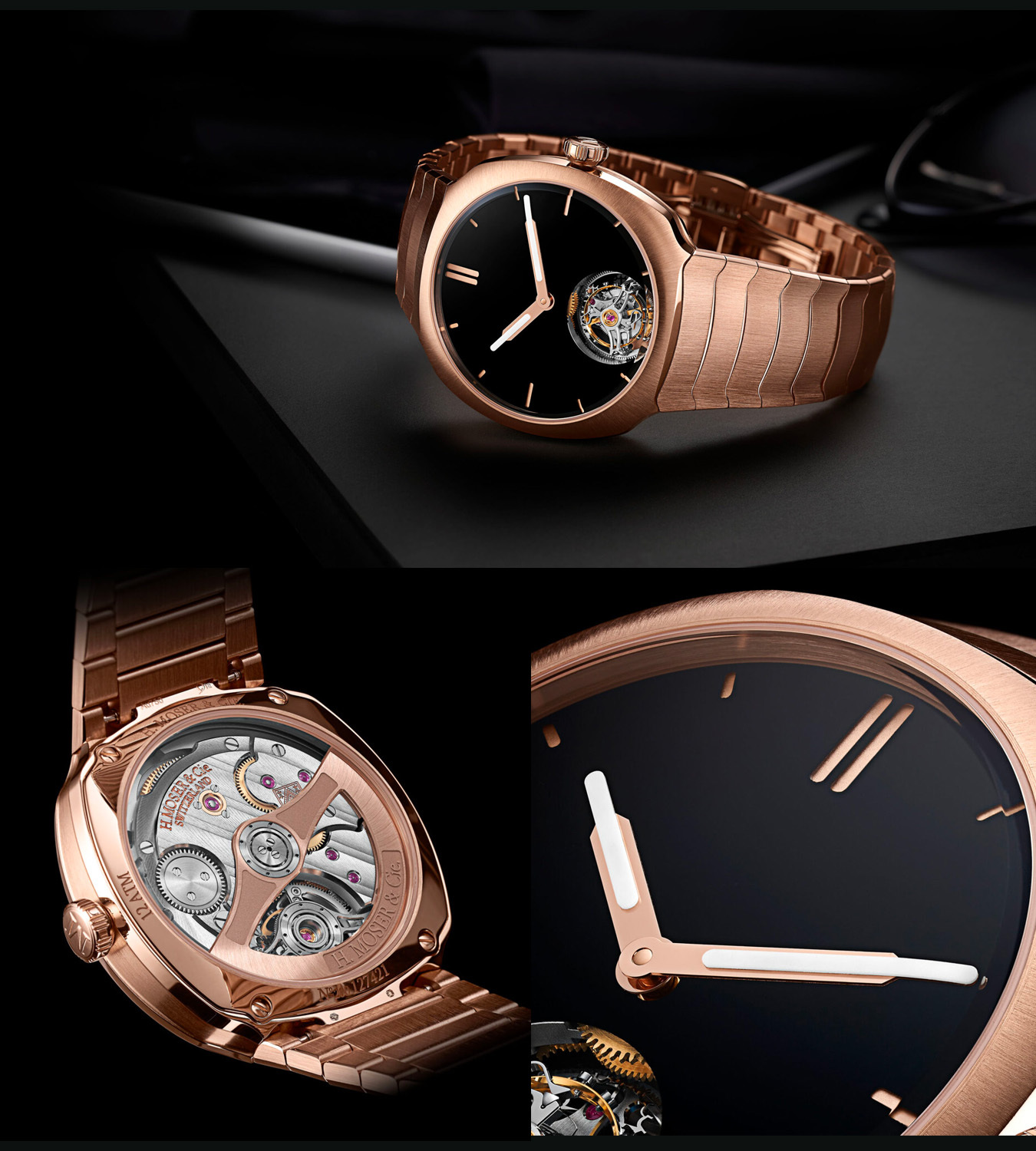 Following on from the all-steel version, H. Moser & Cie. is releasing a red gold Streamliner. The streamlined aesthetic of this ode to minimalism complements the complexity of the automatic movement and the materials chosen. In a striking play of contrasts, H. Moser & Cie. distils the essence of the tourbillon, the traditional Haute Horlogerie mechanism, combining it with Vantablack®, an innovative coating used in astrophysics and taken from the aeronautical industry. Minimalist, ultra-modern and timeless.