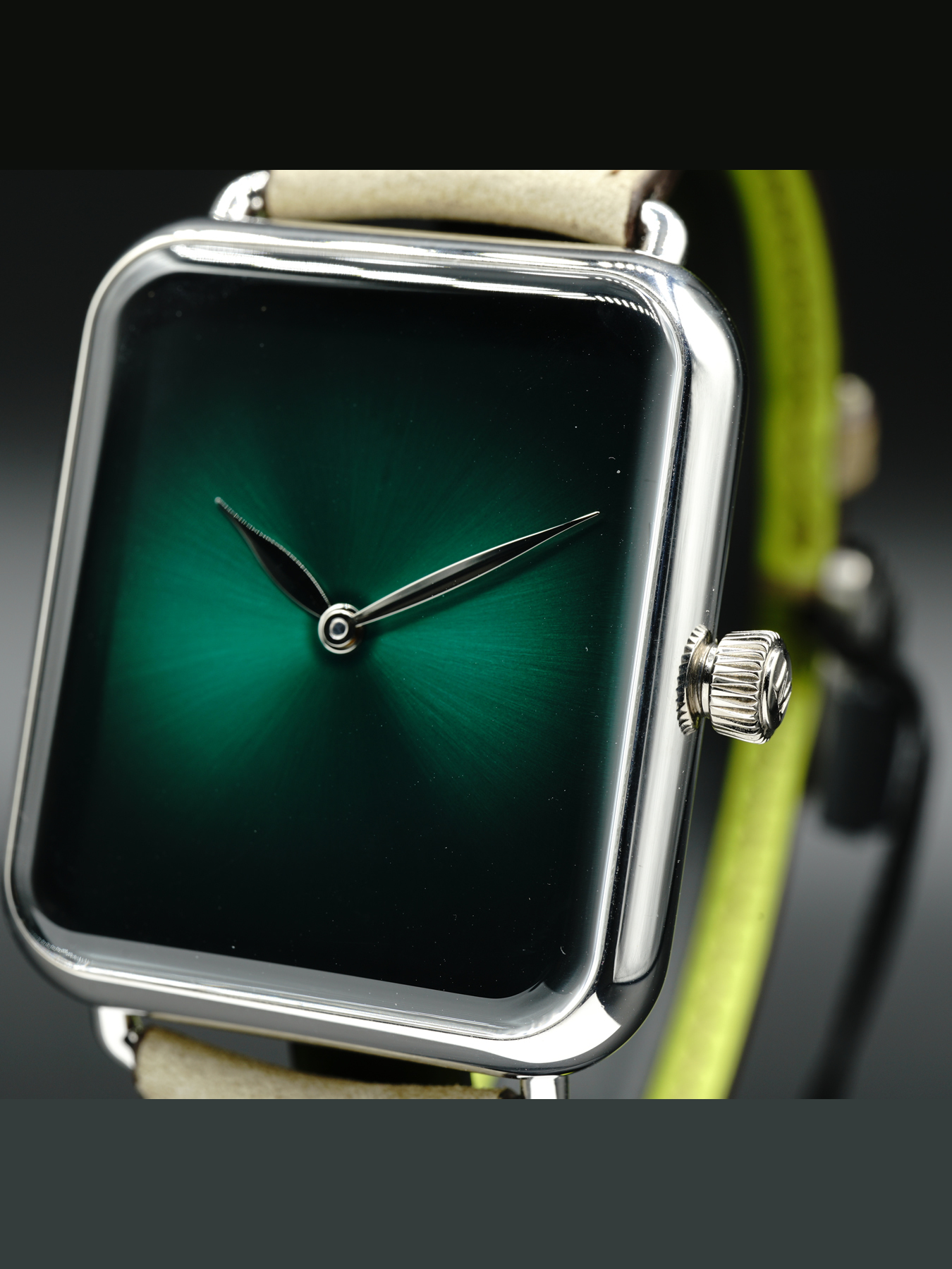 - This timepiece features a 38mm gold case paired with a high quality leather strap. It showcases a distinctive green dial and is powered by a precise manual winding movement. The watch is designed with a water resistance of up to 30M.