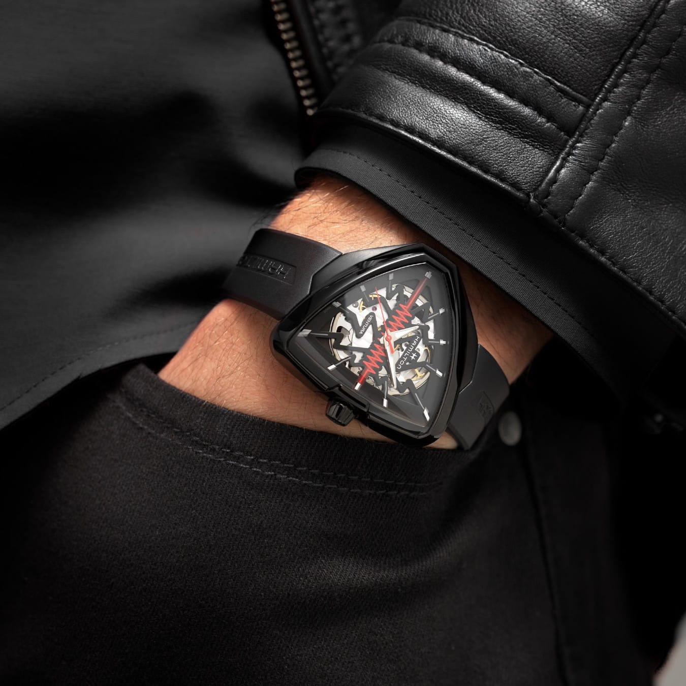Dare to be bold with the Ventura Elvis80 Skeleton, an ultra-modern tribute to the past, present and future of the world’s first electric watch. A powerful evolution of a revolutionary timepiece, its precise skeletonized dial features a striking red zigzag at the center of its sleek, black PVD-coated, triangular case. This bolt of energy celebrates an iconic symbol of innovation and draws the eye to the automatic H-10-S movement underneath.