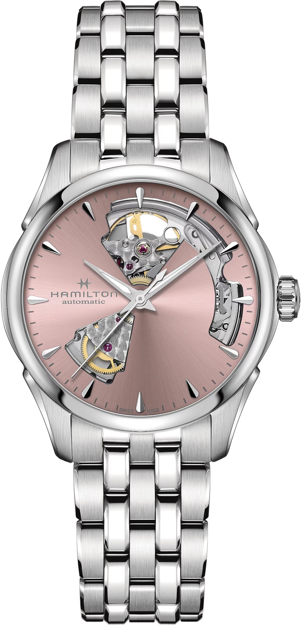 The 36mm Jazzmaster Open Heart demonstrates a perfect balance of classic appearance and innovative craftsmanship. Inspired by the freshness of flowers in bloom, this stainless steel version boasts a dial with a precise cut-out design dressed in subtle pink for feminine flair and crisp style.