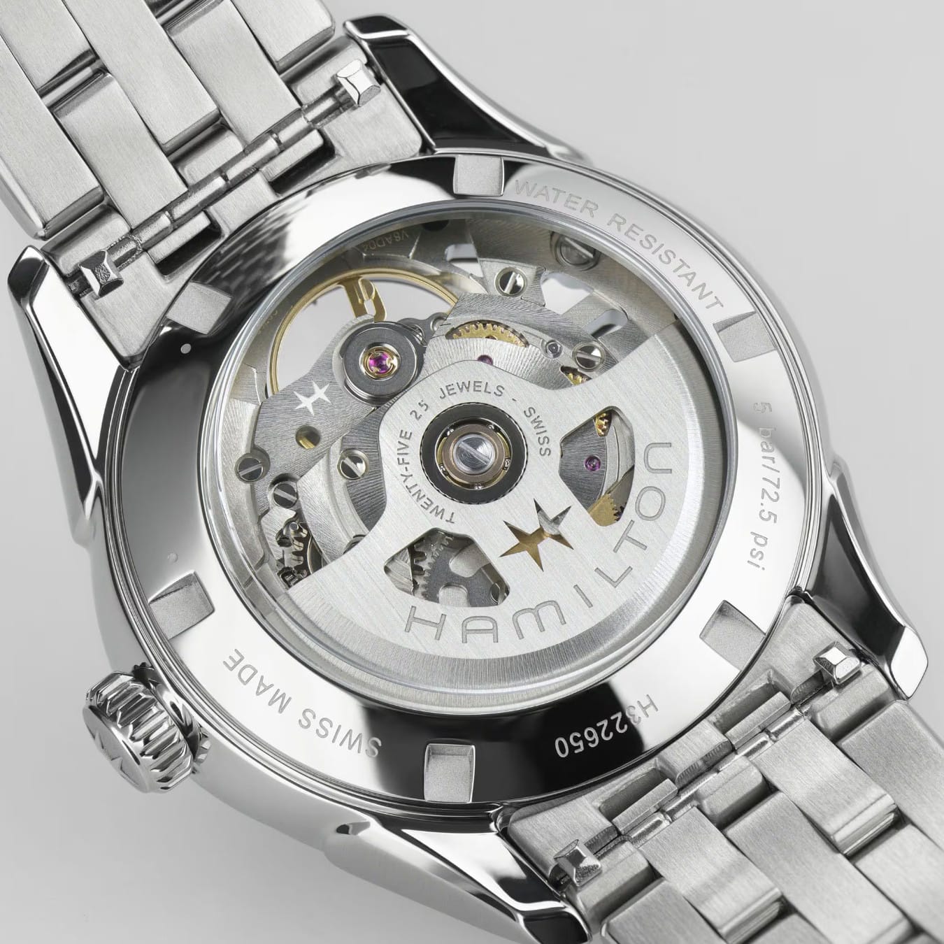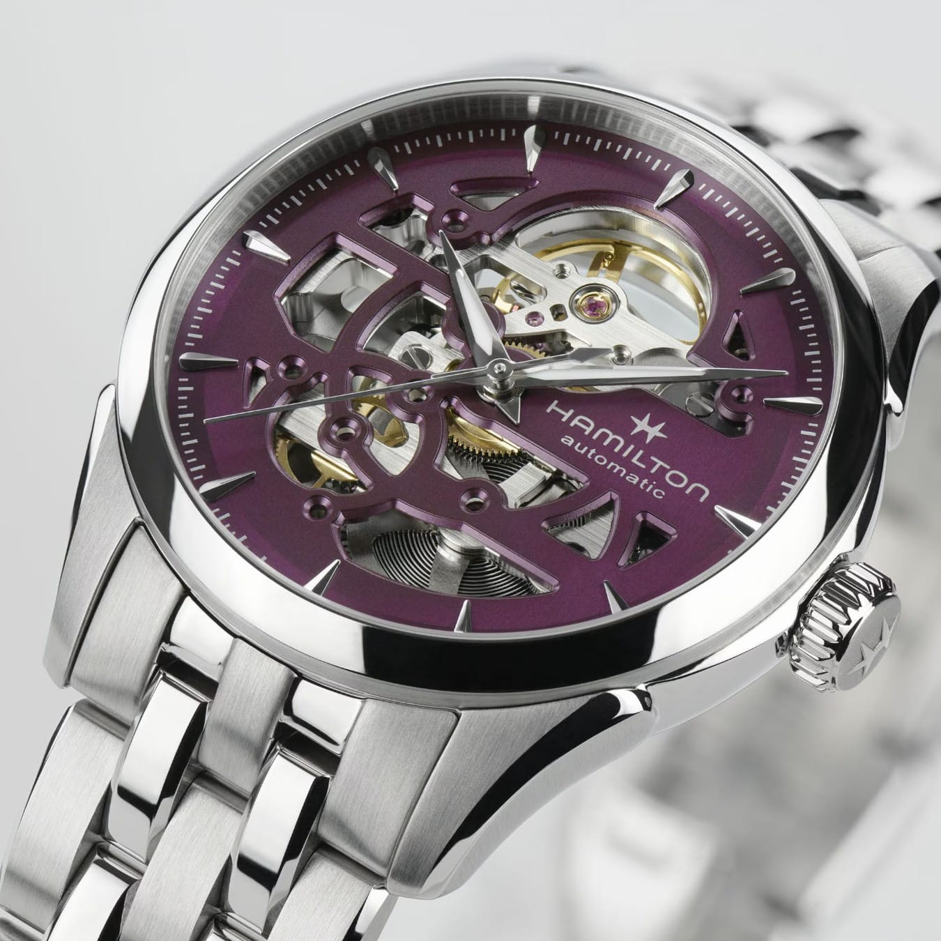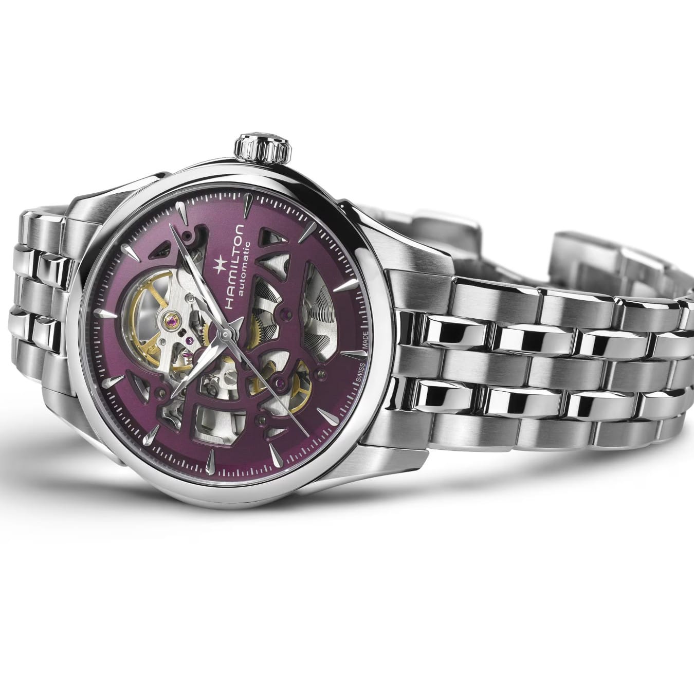 Let precision take centre stage with the 36mm Jazzmaster Skeleton and its purple cut-out dial, revealing the subtle beauty of this timepiece's inner mechanics. Bringing the H-10-S automatic movement into the spotlight, with an 80 hour power reserve and Nivachron™ balance spring, the Jazzmaster Skeleton is fitted with an intricate stainless steel bracelet, showcasing Hamilton's ever-evolving craftsmanship and attention to detail.