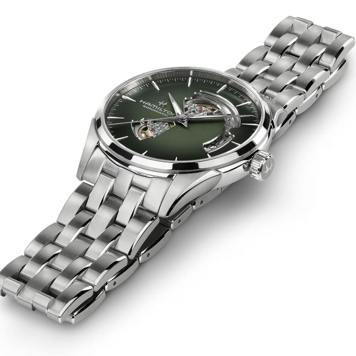 Offering a glimpse of its powerful inner mechanics, the Jazzmaster Open Heart lets precision take center stage with a new 42mm dial. Featuring a stunning gradient colour effect in rich green, this timepiece reveals its subtle beauty and showcases Hamilton's ever-evolving craftsmanship and attention to detail. Bringing the H-10 automatic movement into the spotlight, with an 80 hour power reserve and Nivachron™ balance spring, the Jazzmaster Open Heart Auto is fitted with an intricate stainless steel bracelet.