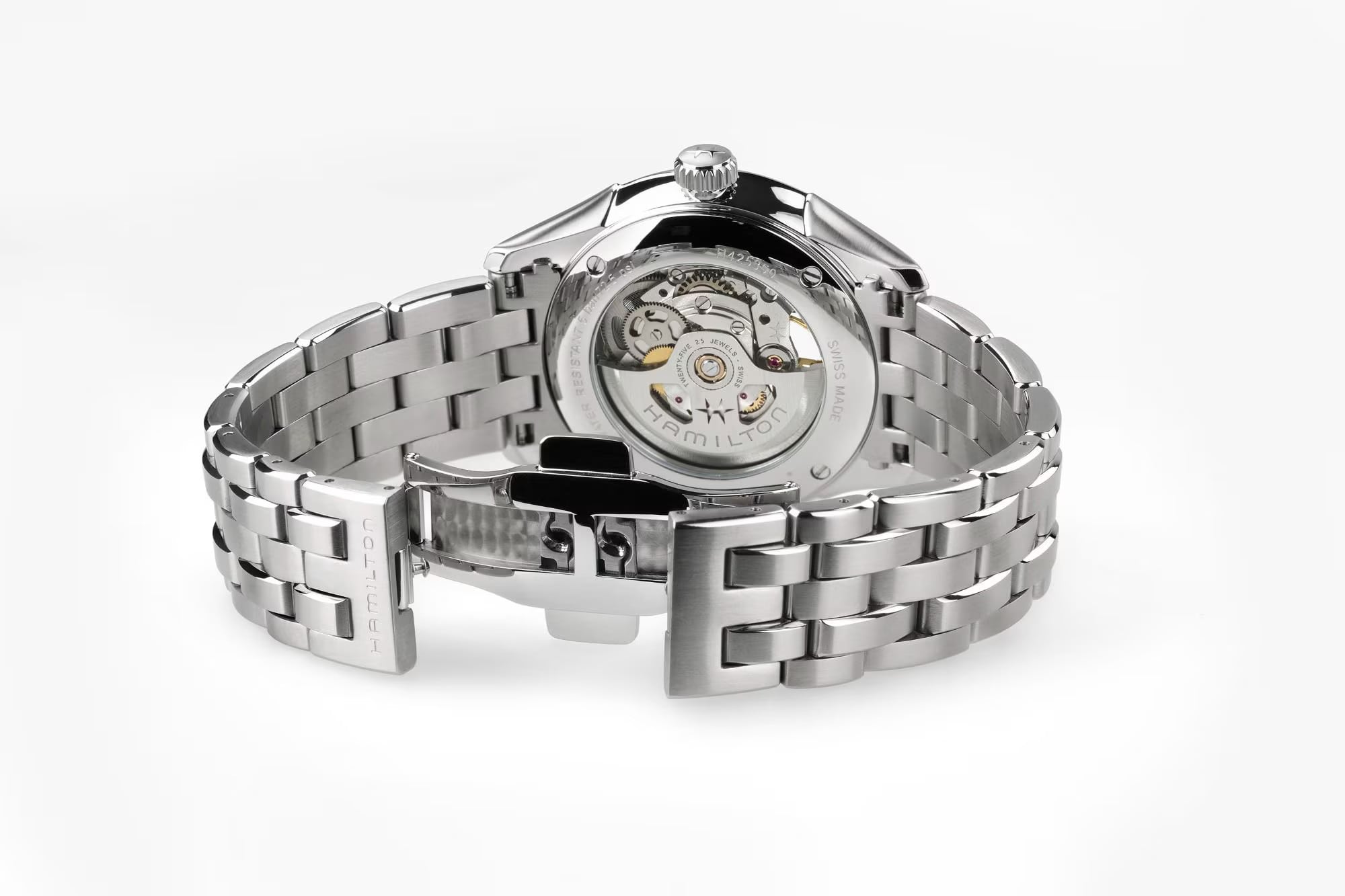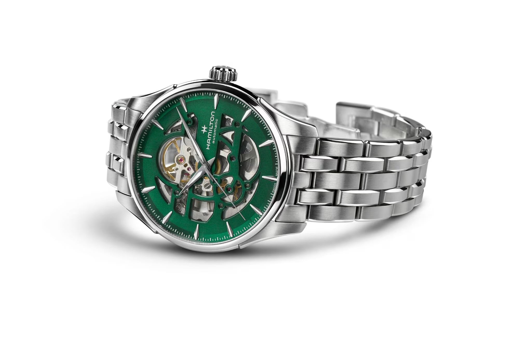 Seamlessly blending tradition with innovation, the Jazzmaster Skeleton 40mm offers a glimpse of its Swiss automatic movement in action. Set in striking Empire green, the open-worked dial reveals the automatic H-10-S movement, featuring 25 jewels and an impressive 80-hour power reserve. This iconic timepiece is paired with a sleek stainless steel metal bracelet, exuding both modern dynamism and timeless appeal.