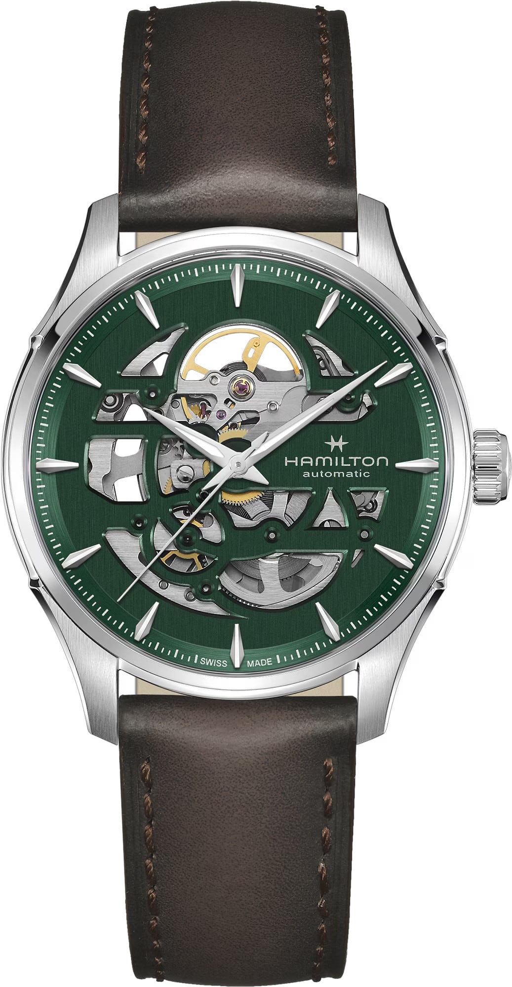 Seamlessly blending tradition with innovation, the Jazzmaster Skeleton 40mm offers a glimpse of its Swiss automatic movement in action. Set in striking Empire green, the open-worked dial reveals the automatic H-10-S movement, featuring 25 jewels and an impressive 80-hour power reserve. This iconic timepiece is paired with a smooth leather strap, exuding both modern dynamism and timeless appeal.