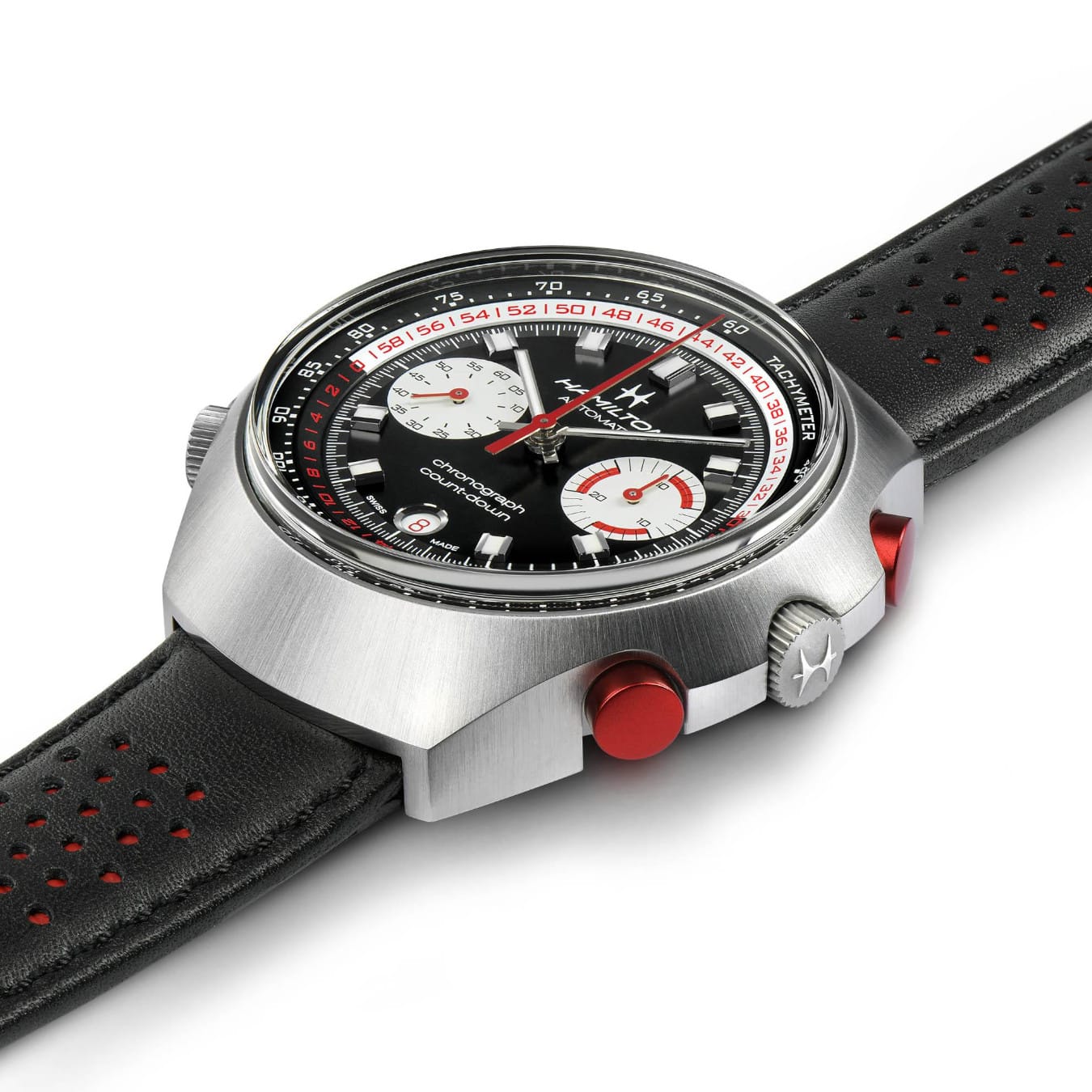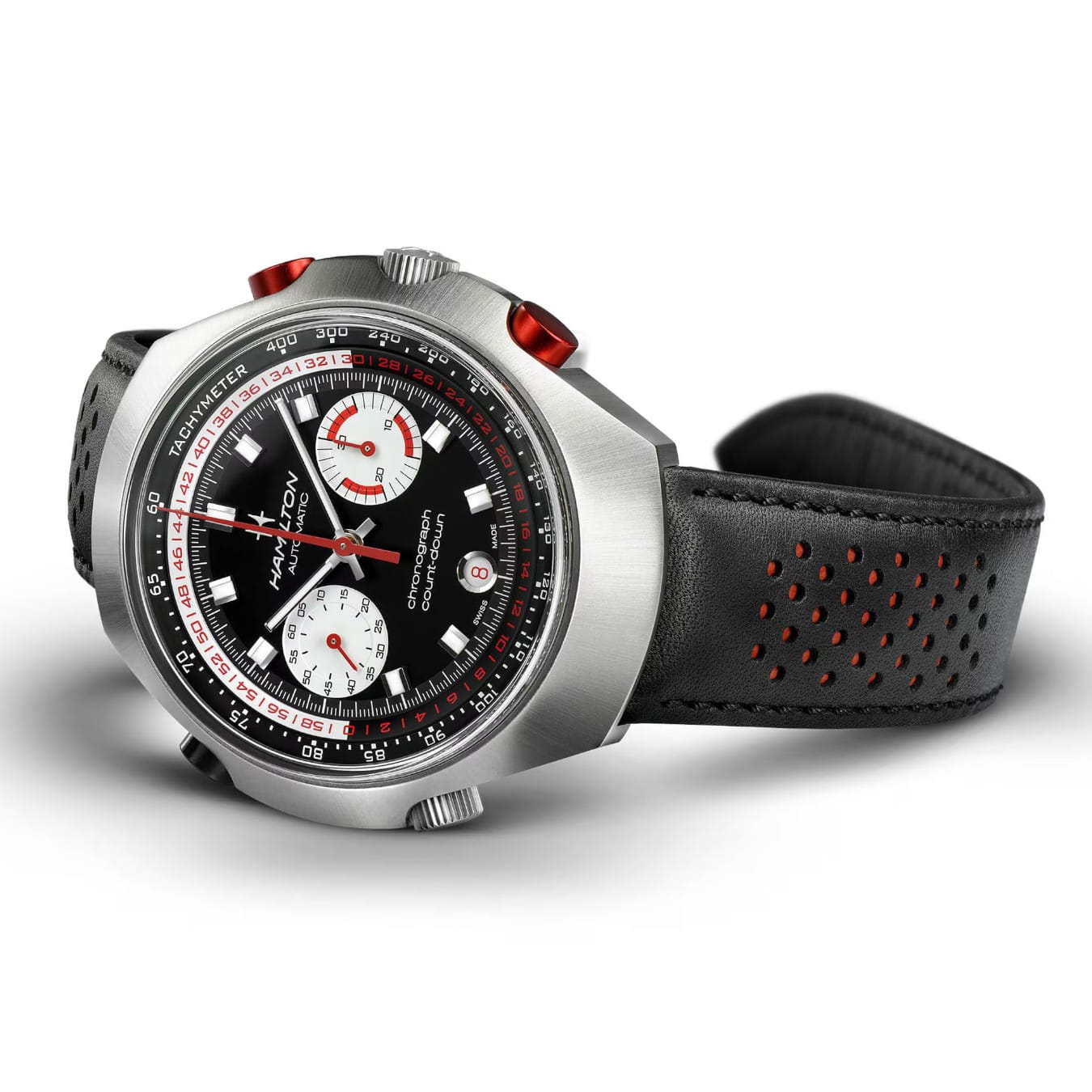 Distinctive, daring and definitely an attention-grabber, the Chrono-Matic 50 is based on the Chrono-Matic E and limited to 1,972 pieces. Powered by the H-31 automatic movement, at 48 mm, it’s not for the faint hearted. The reverse panda dial is a signature Hamilton style statement. Bold red color accents underscore the dynamism of this multifunctional timekeeper which includes a countdown scale.