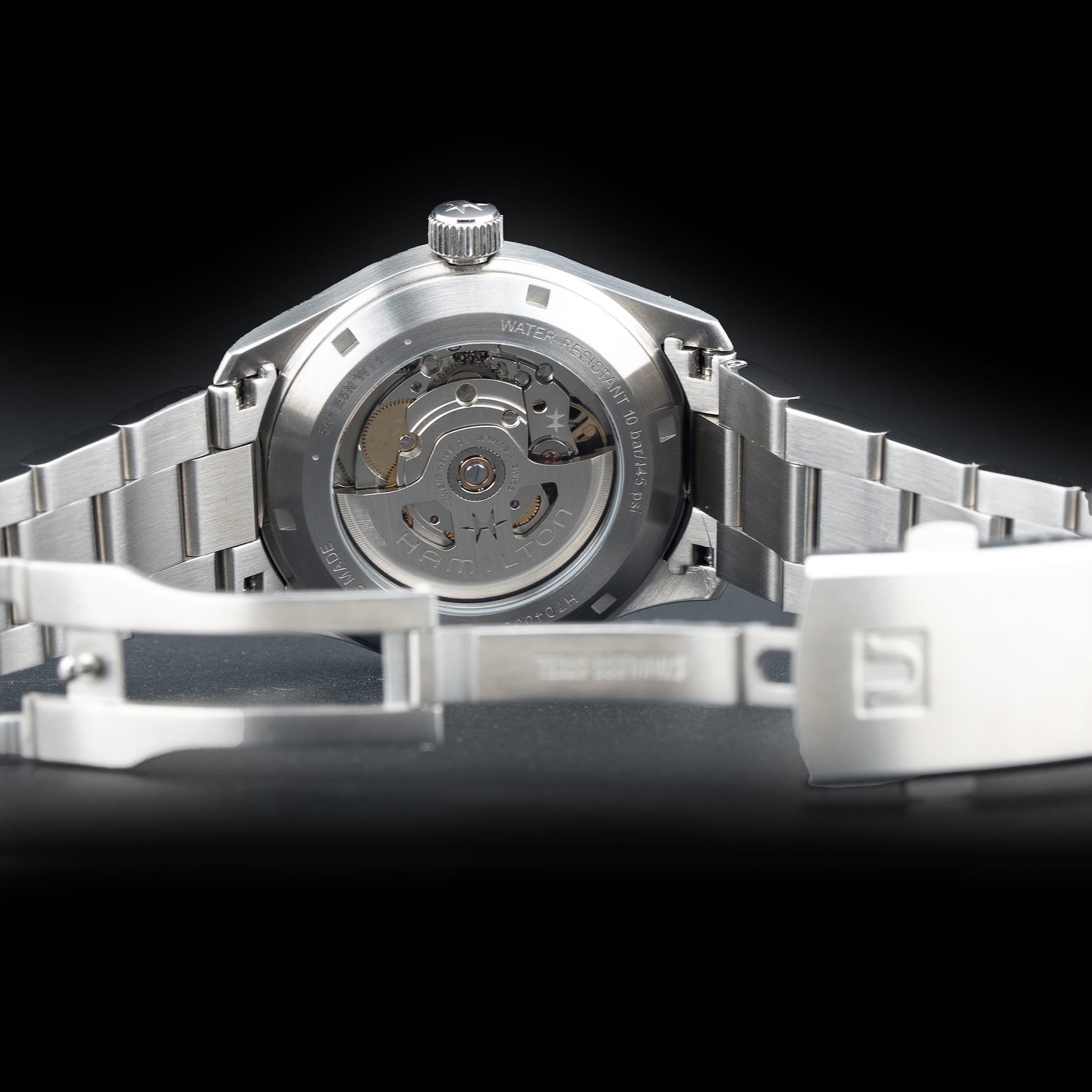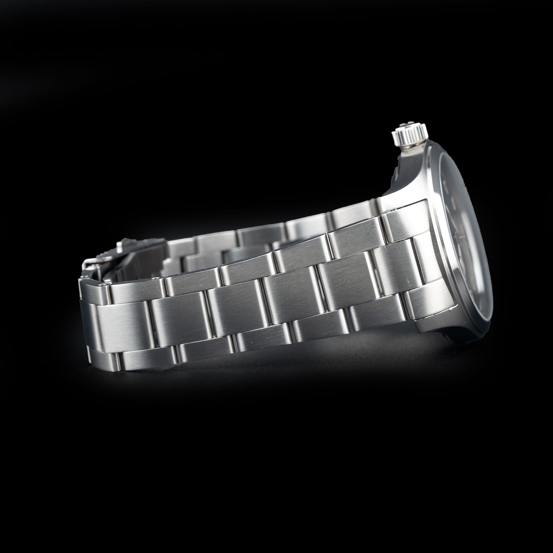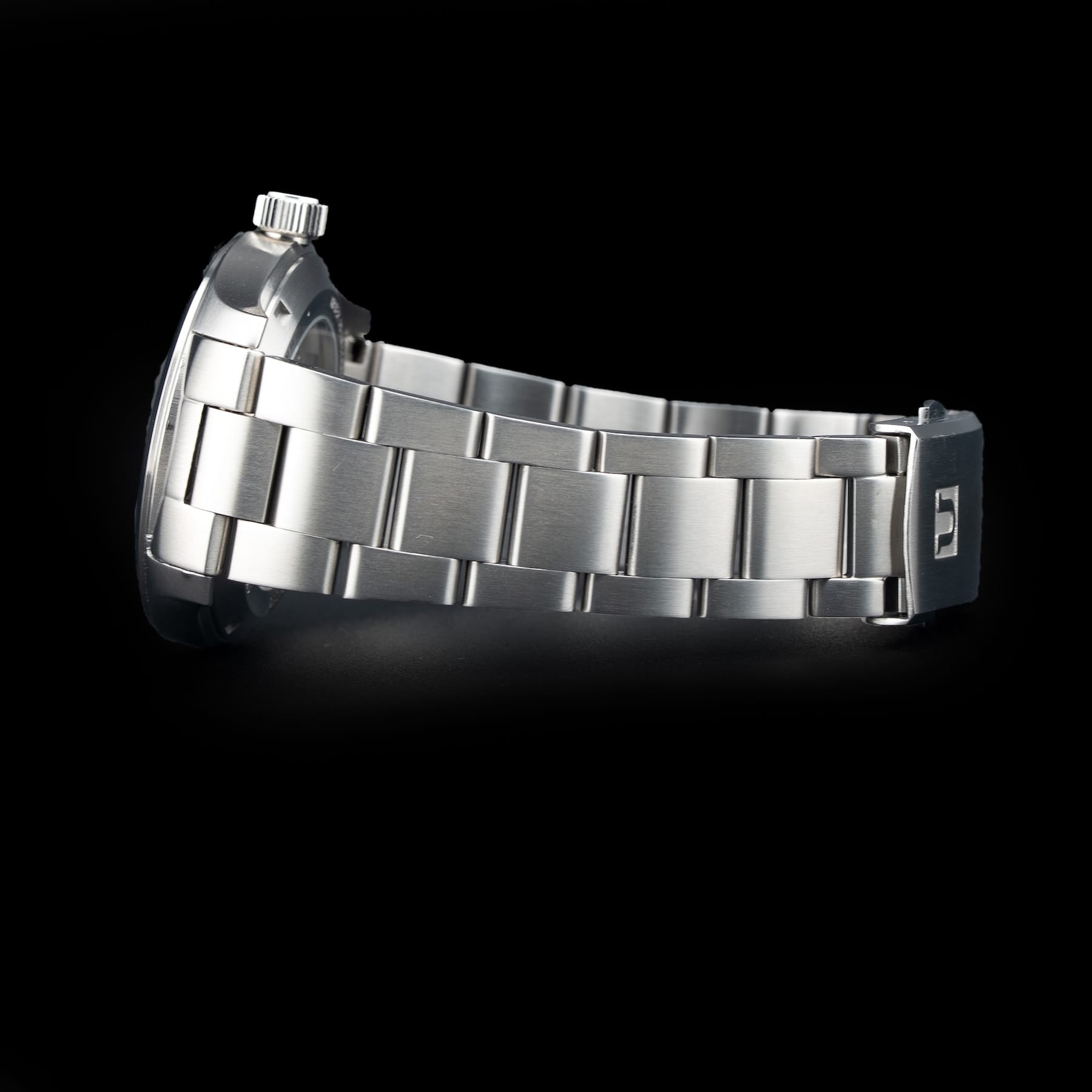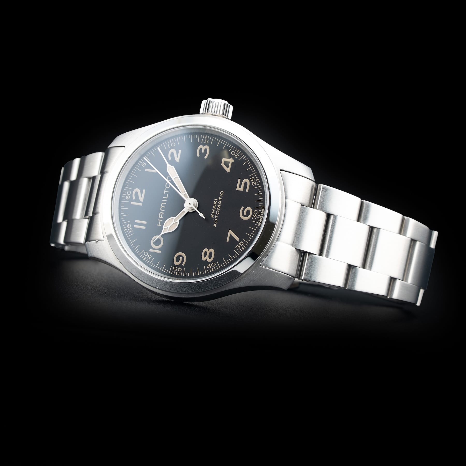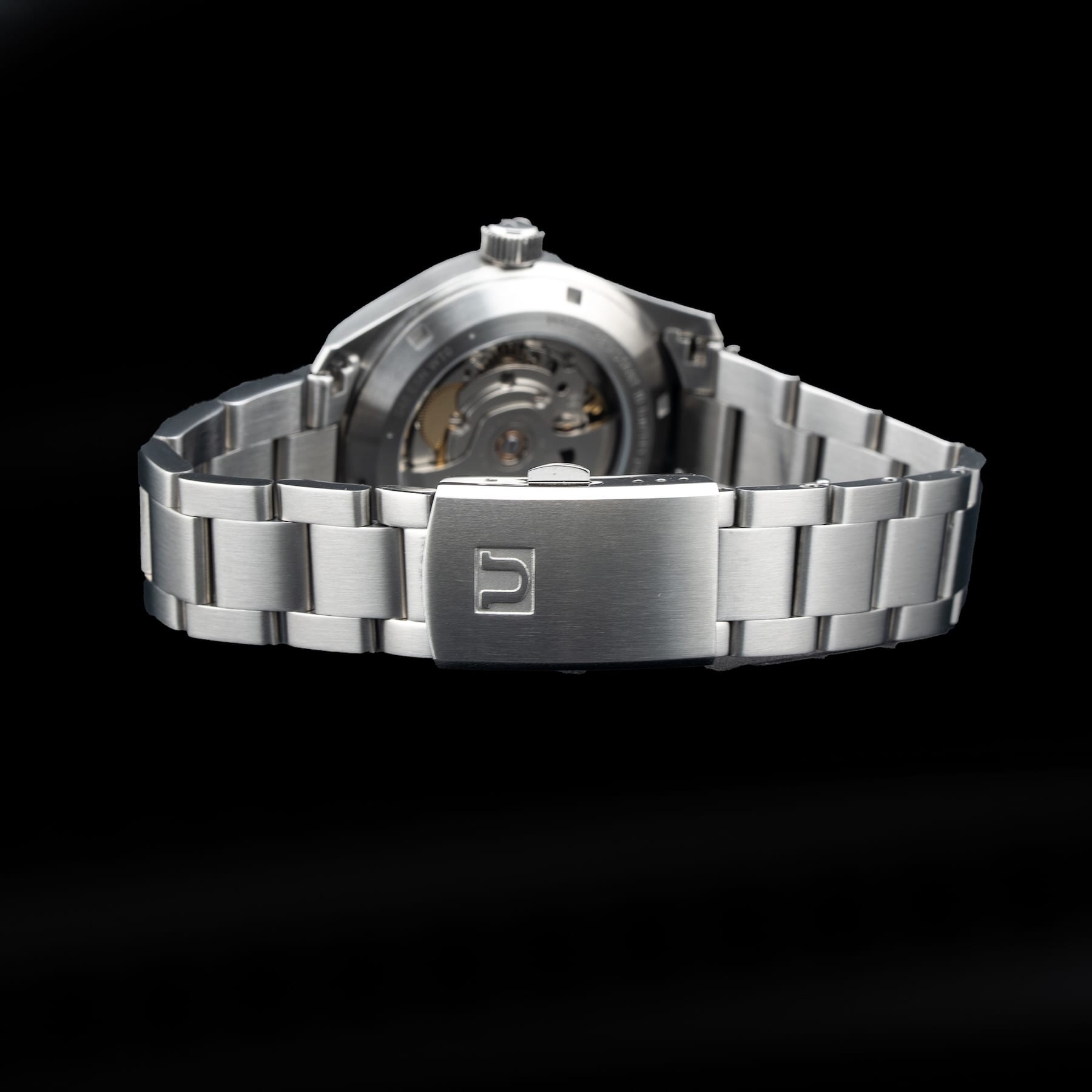 - This timepiece features a 38mm steel case paired with a high quality steel bracelet. It showcases a distinctive black dial and is powered by a precise automatic winding movement. The watch is designed with a water resistance of up to 100m.