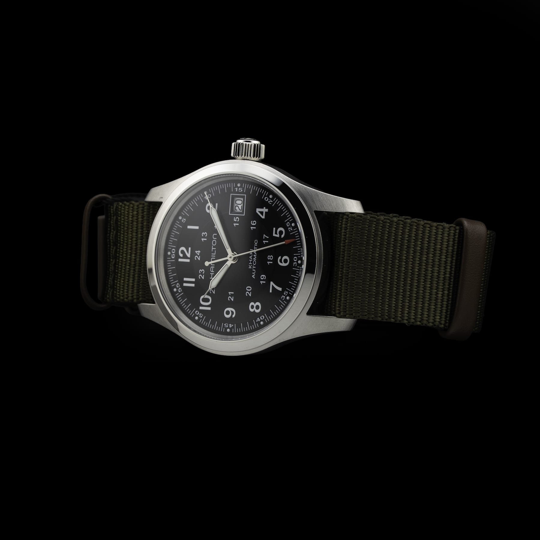 - This timepiece features a 38mm steel case paired with a high quality nato strap. It showcases a distinctive black dial and is powered by a precise automatic winding movement. The watch is designed with a water resistance of up to 100m.