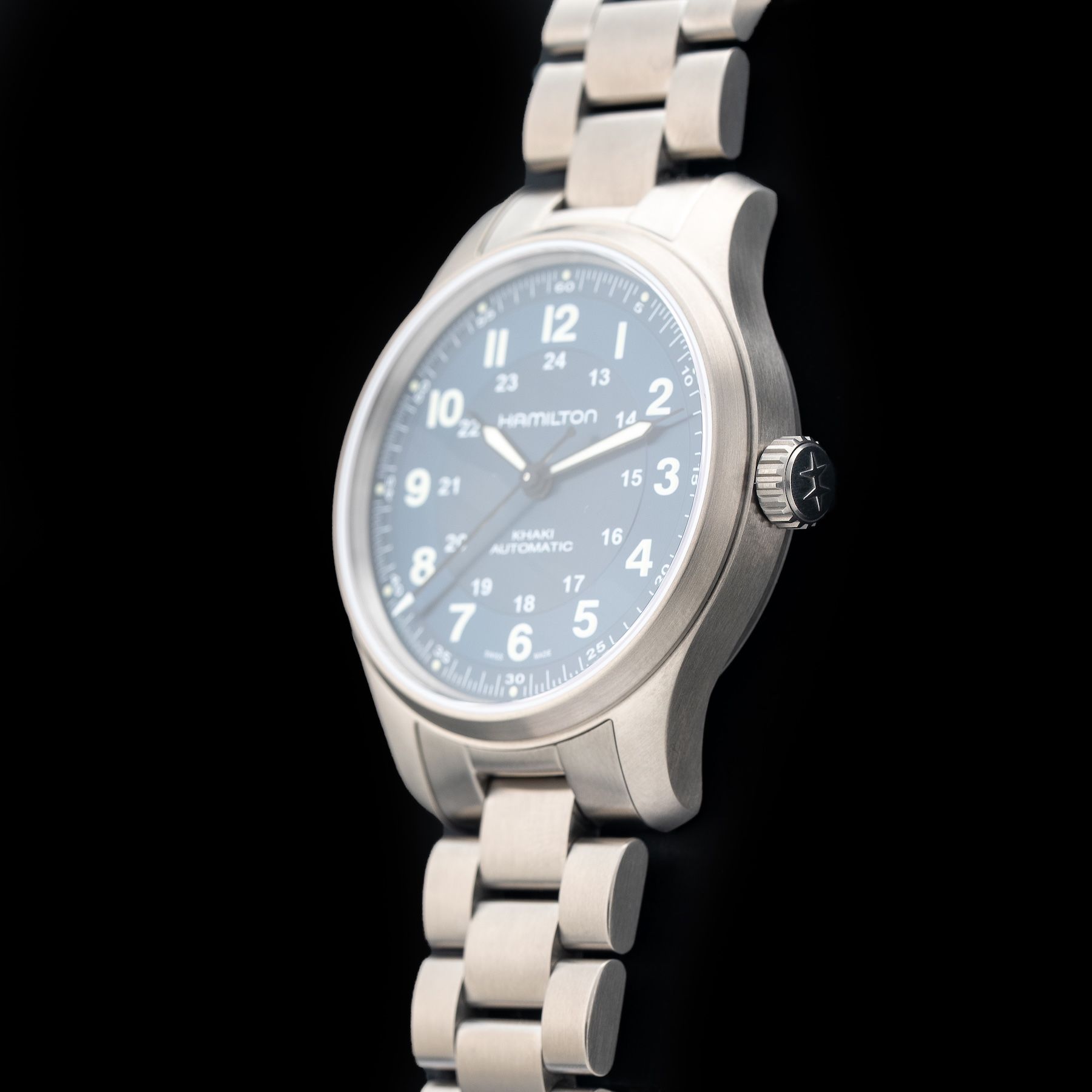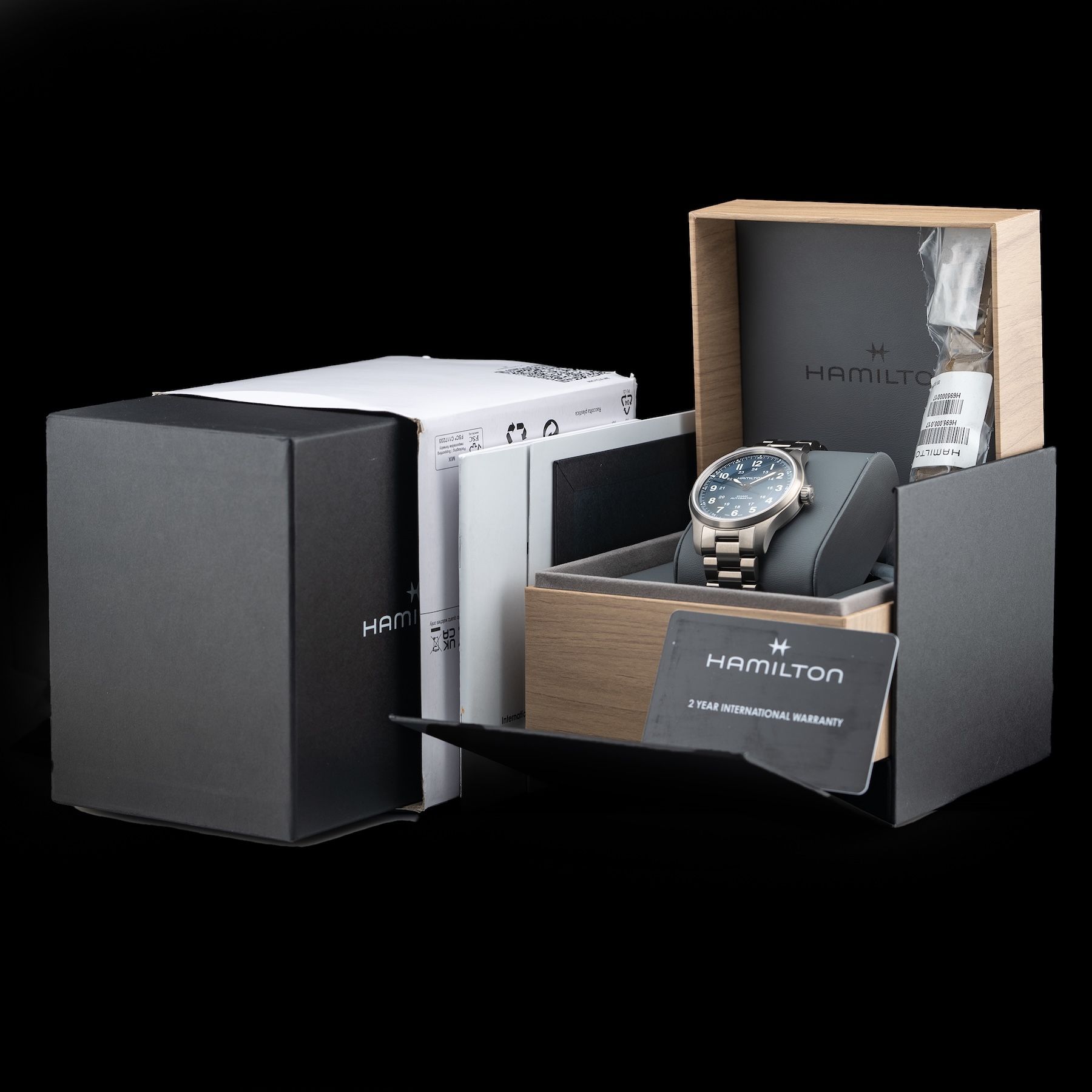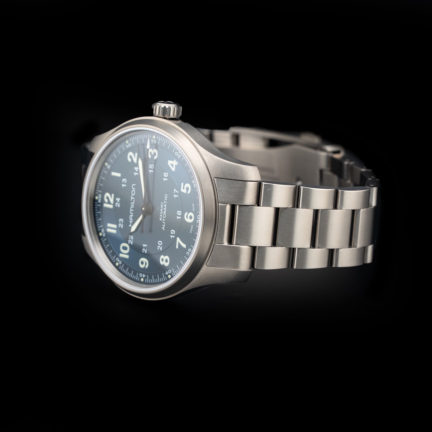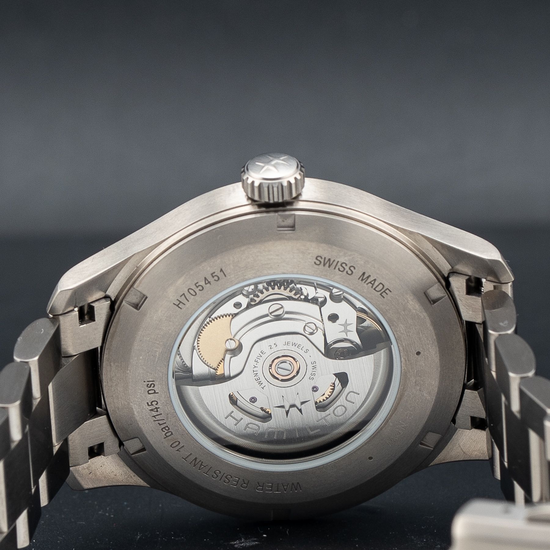 This watch features a 42mm titanium case on titanium bracelet. This watch also sports a blue dial. Powered by a H-10 automatic movement. Water resistance up to 100 meters.