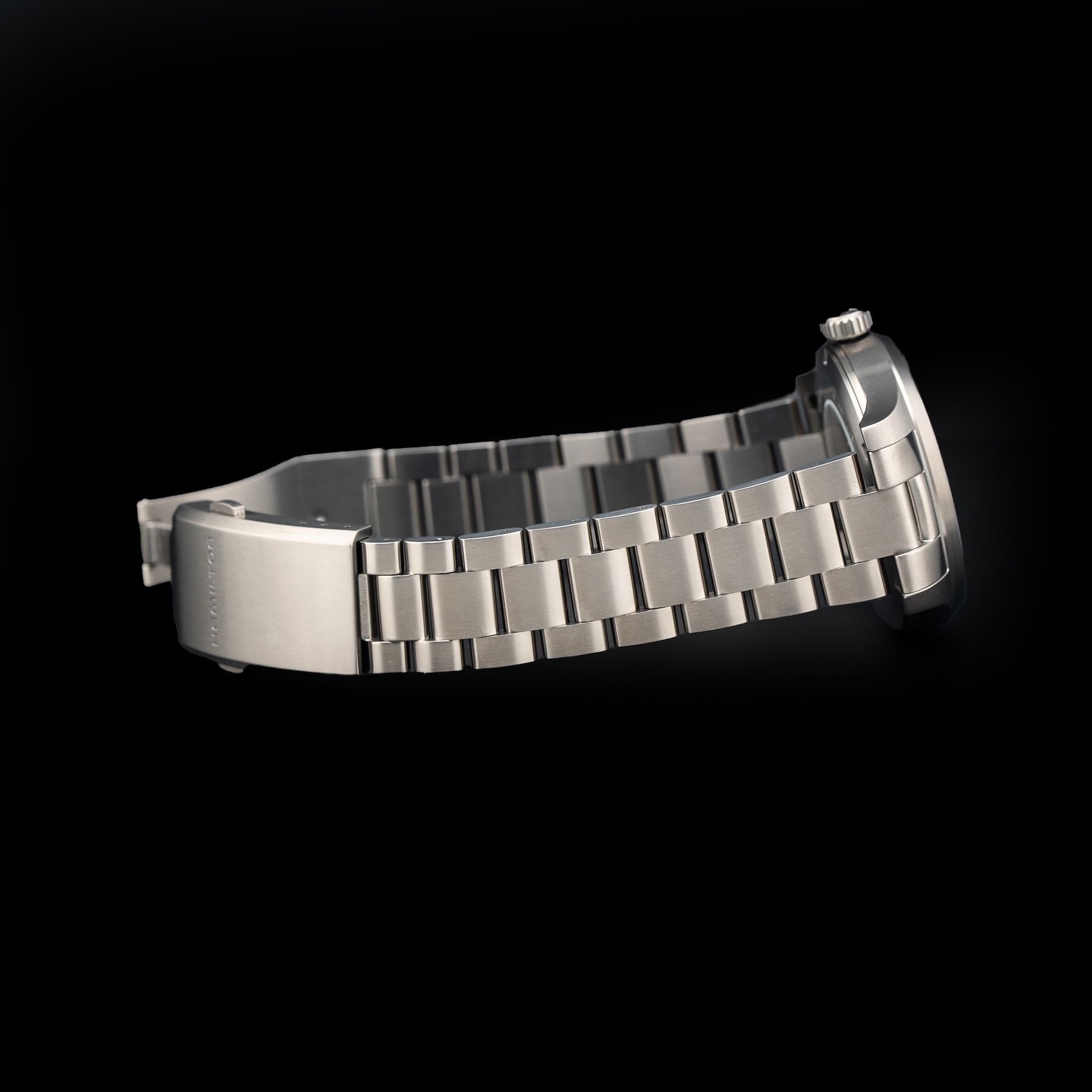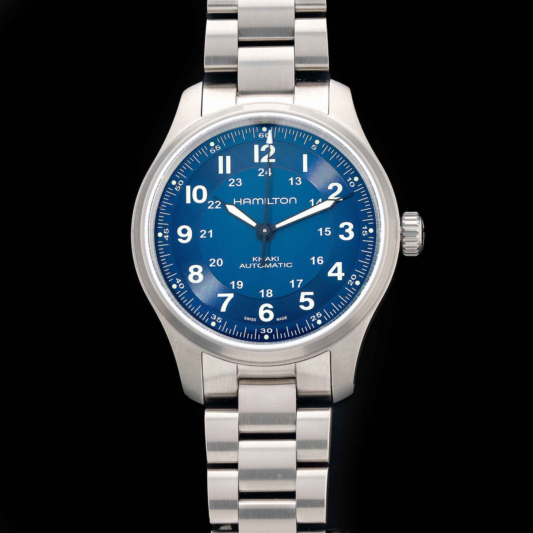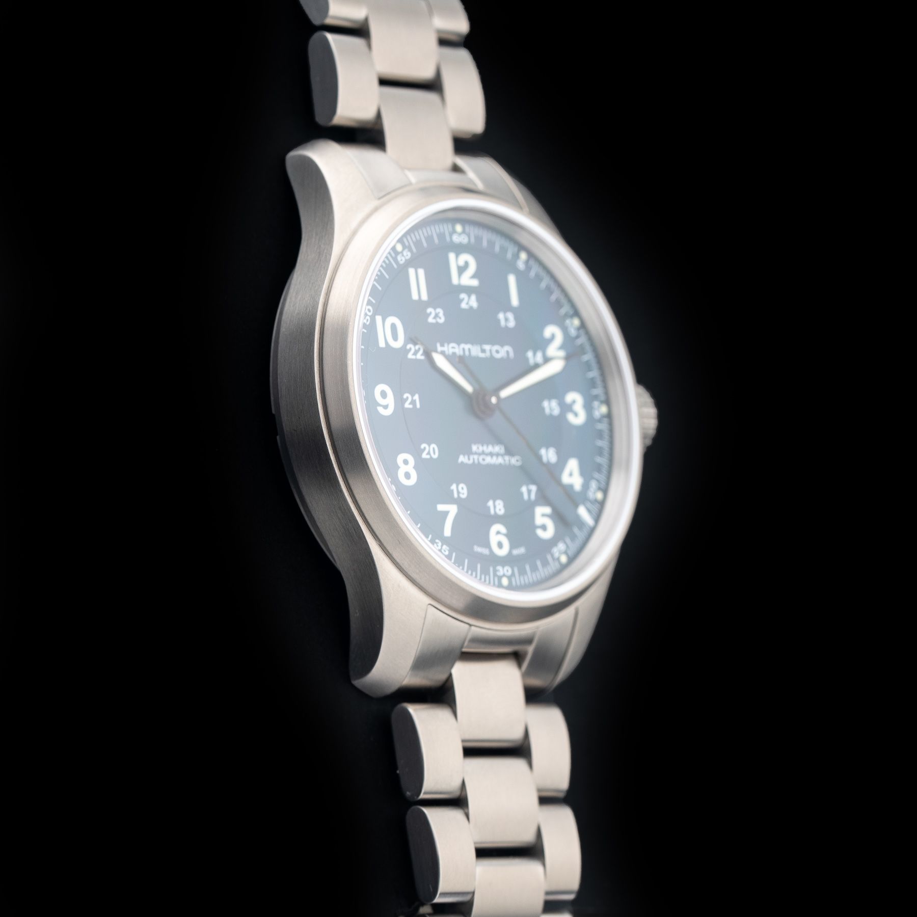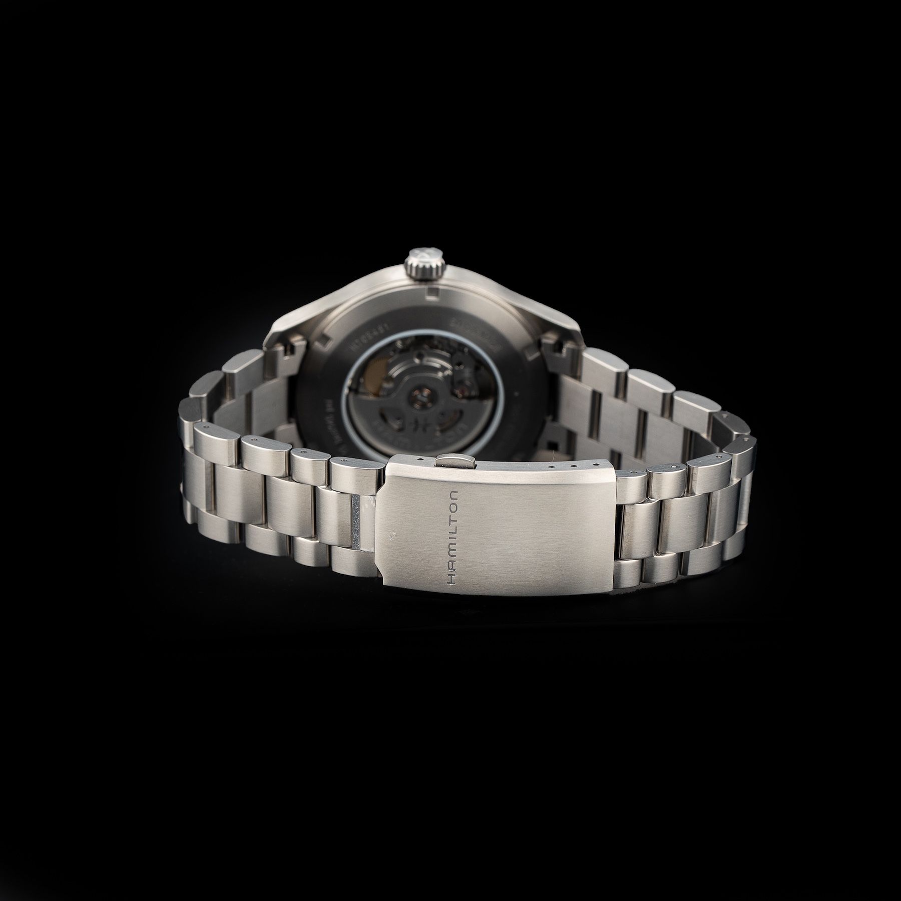This watch features a 42mm titanium case on titanium bracelet. This watch also sports a blue dial. Powered by a H-10 automatic movement. Water resistance up to 100 meters.