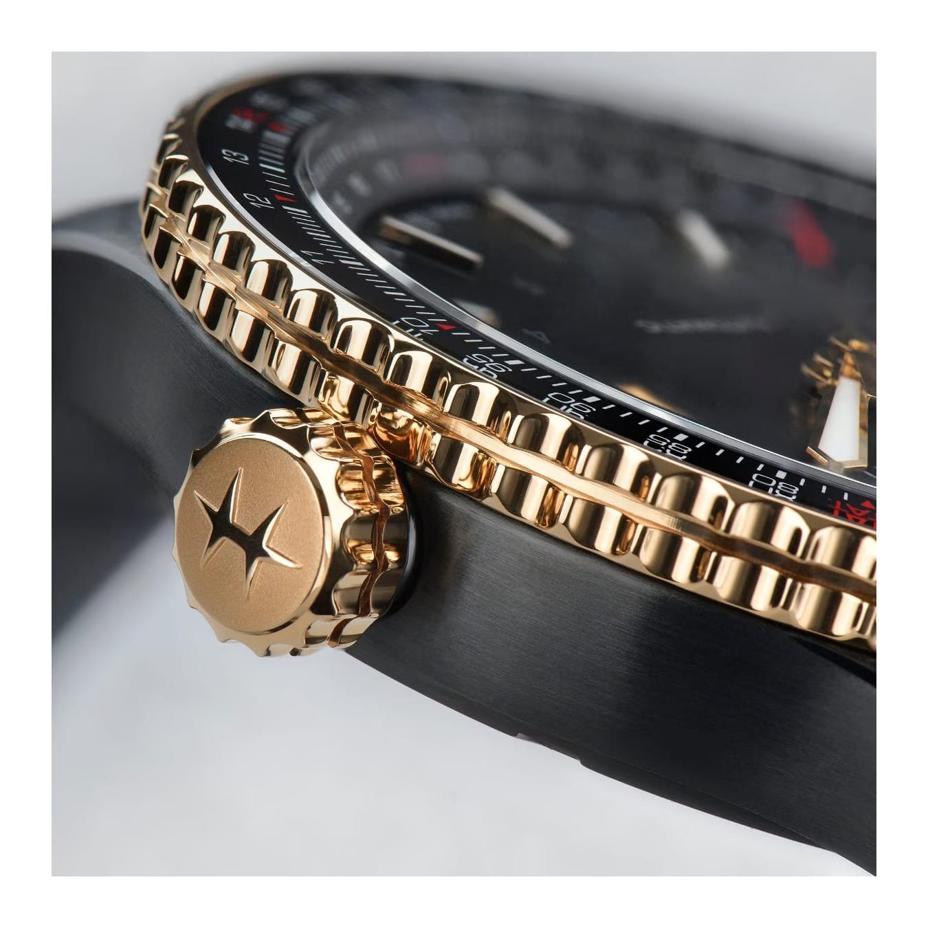 Advanced technology meets sophisticated style in the Khaki Aviation Converter. A bi-directional, rotating slide-rule bezel makes critical calculations and conversions with ease; and the most advanced anti-magnetic hairspring alloy yet invented, NivachronTM, ensures precision in any environment. Perfect for the modern pilot or urban jetsetter, the 42mm sleek black dial covers an H-10 automatic movement with 80-hour power reserve.