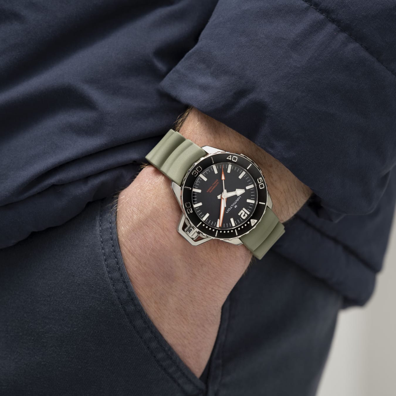 The Khaki Navy Frogman Automatic stands out for its technical performance and distinctive look. Its 41mm stainless steel case features a screw-down crown protected by a robust bridge-shaped crown guard to ensure its 30 bar (300m) water-resistance, a nod to the original Frogman’s design. Boasting a black dial with touches of Super-LumiNova® to ensure precise readings under any circumstances, this 41mm Khaki Navy Frogman Automatic is fitted with a black waved rubber strap evoking the moving sea surface. Functional and wearable at once, this timepiece is a hero underwater and on land.
