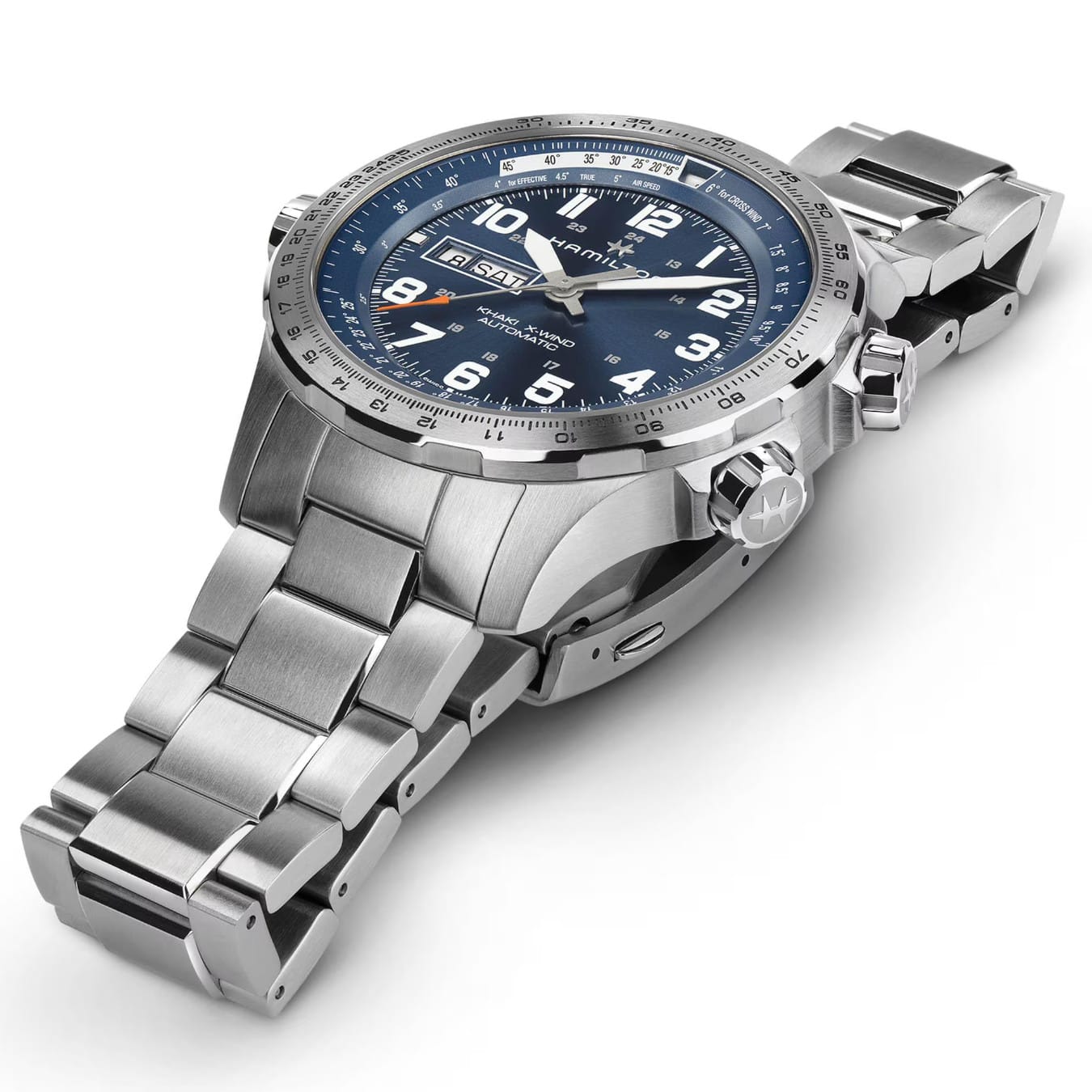 Hamilton has extended the Khaki X-Wind collection to include an automatic Day Date model. It relies on large SuperLumiNova® numerals and sporty hands for super readability - even when you only have a split second to glance at the dial. The Day Date window at 9 o'clock ensures the display is well balanced, clean, clear and ready for take off.