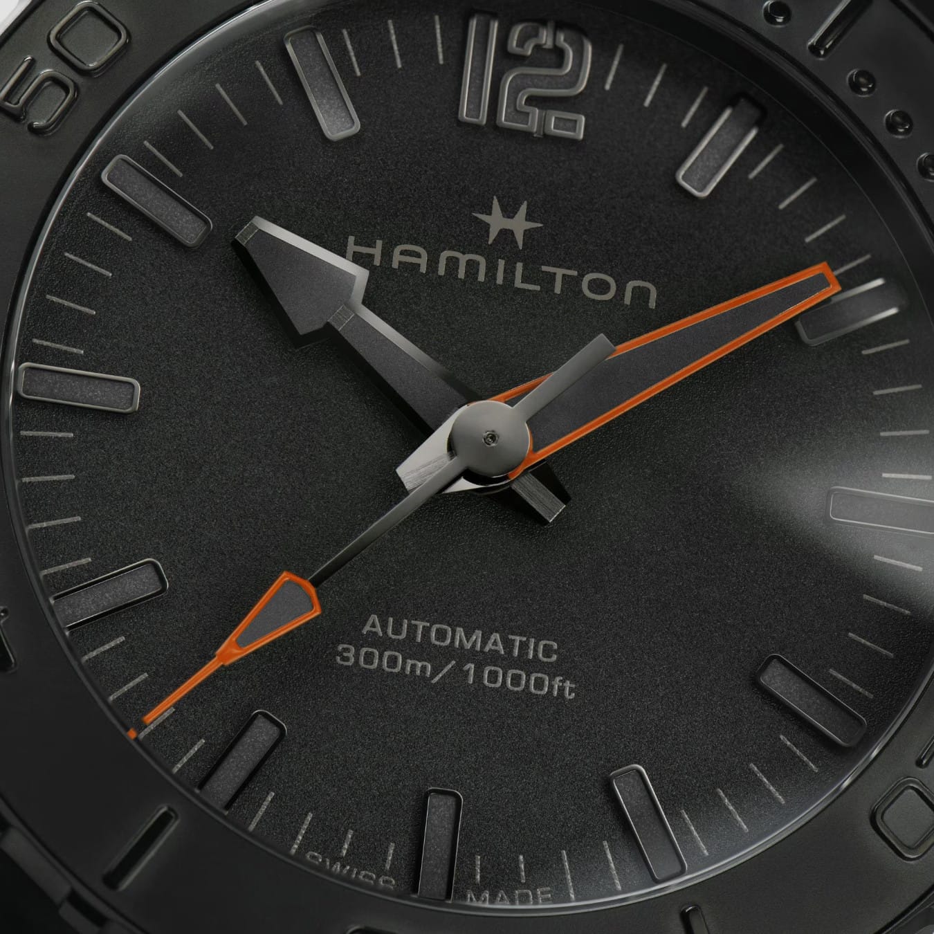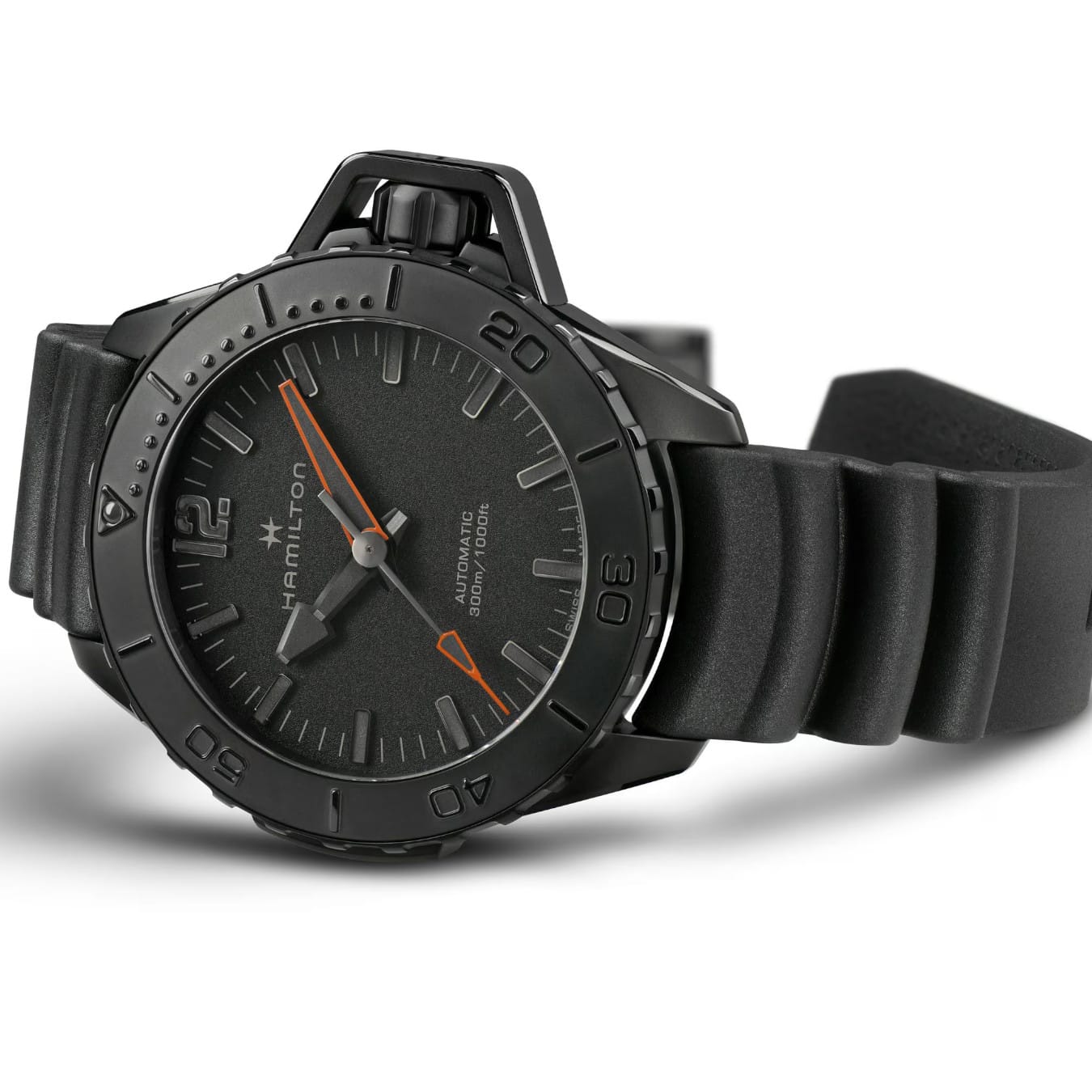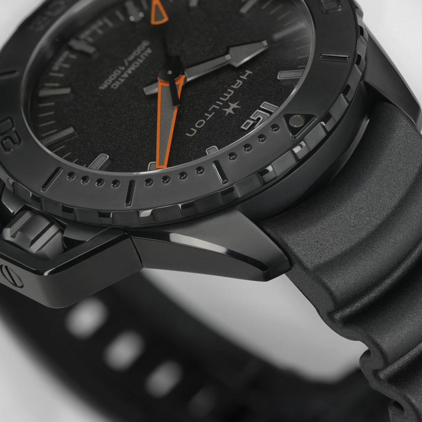 With an intrepid new look, the Khaki Navy Frogman Automatic is Hamilton’s most technically capable maritime-ready watch. Engineered for accuracy, legibility and endurance, the precision instrument brings the unfathomable power of the ocean to the wrist with a uniquely shaped crown protector and wave-look tactical rubber strap.