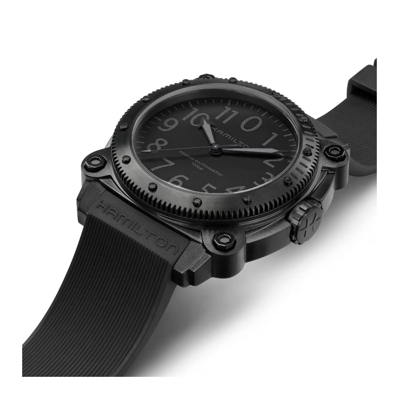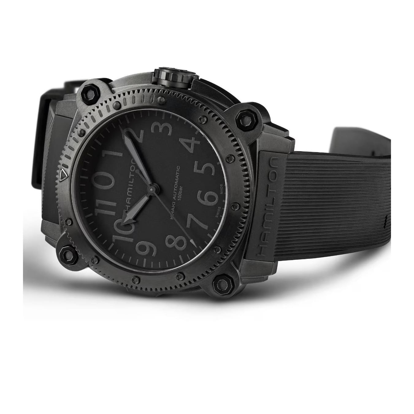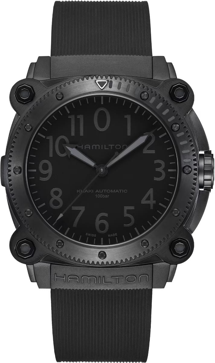 A new titanium case adds lightweight durability to the high performing Khaki Navy BeLOWZERO. Water resistant to 100 bar (1,000 m) and equipped with a helium escape valve, this submarine-inspired watch is perfect for your next water adventure. The impressive 46mm titanium case treated with black PVD is the epitome of stealth style and features a special diving mask embossed on the case back.