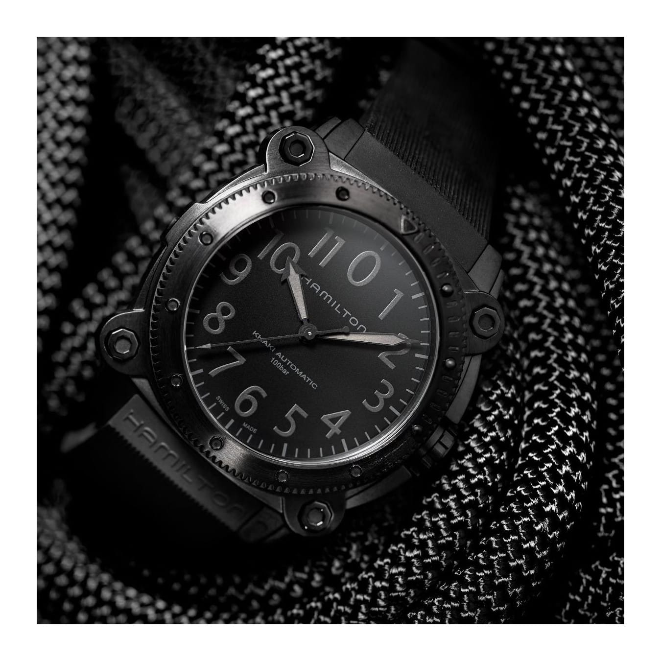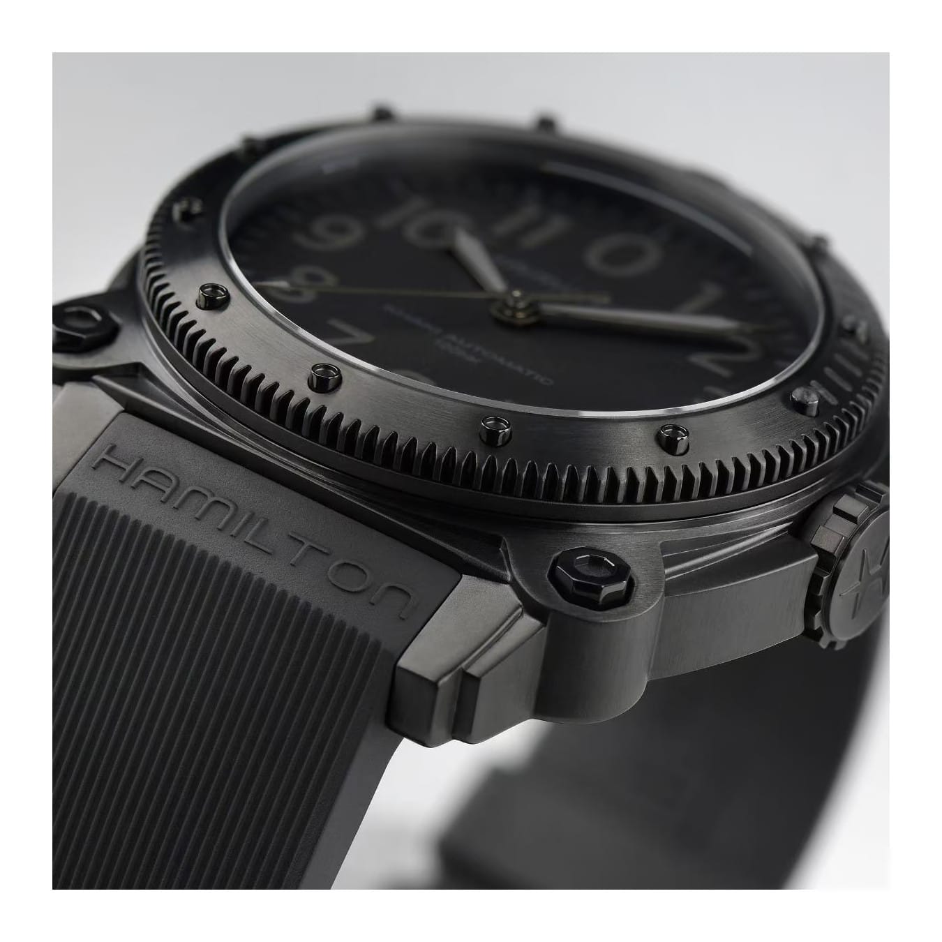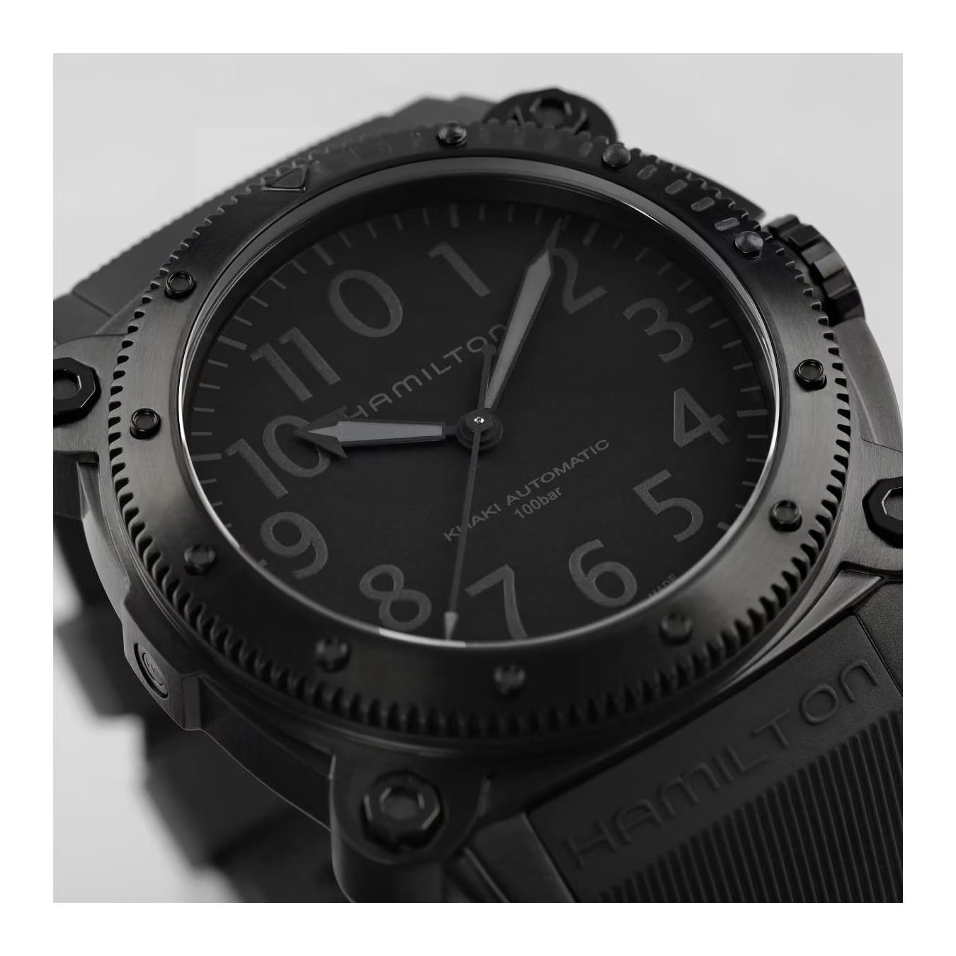 A new titanium case adds lightweight durability to the high performing Khaki Navy BeLOWZERO. Water resistant to 100 bar (1,000 m) and equipped with a helium escape valve, this submarine-inspired watch is perfect for your next water adventure. The impressive 46mm titanium case treated with black PVD is the epitome of stealth style and features a special diving mask embossed on the case back.