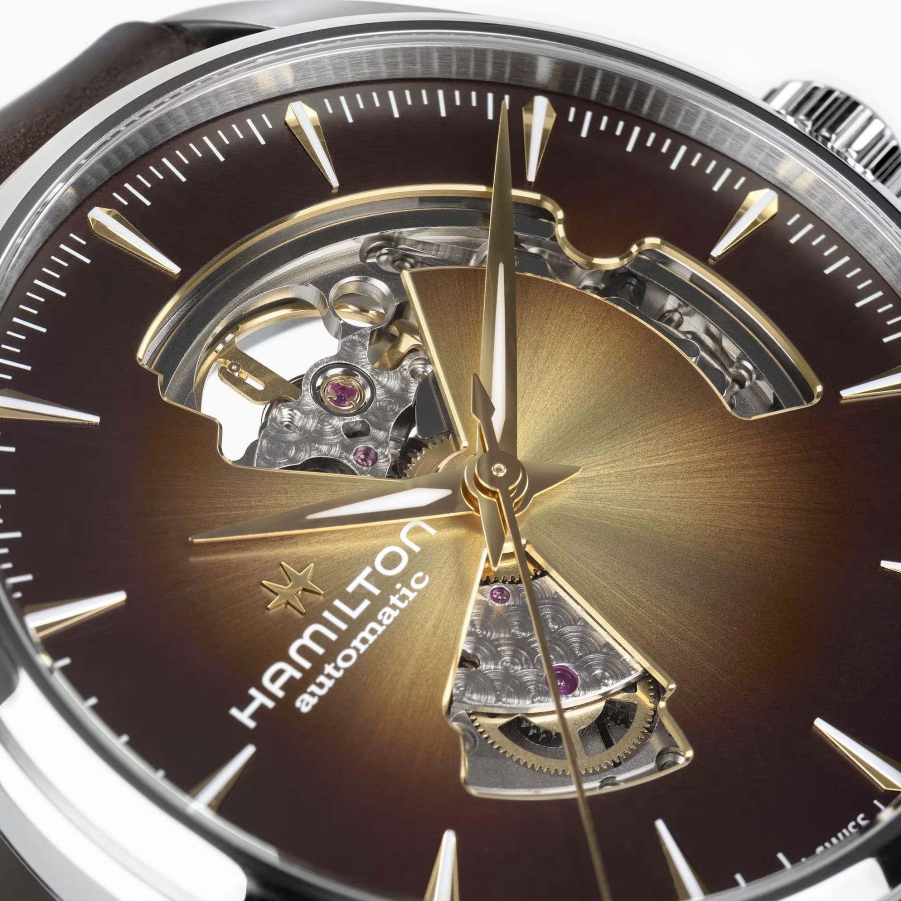 Inviting and timeless, the Jazzmaster Open Heart 42mm features a smoky brown dial that exudes warmth and depth. The open-heart design showcases the precision mechanics inside, while a rich brown leather strap adds a classic touch. A classic dress watch that blends contemporary elegance with sophisticated style.