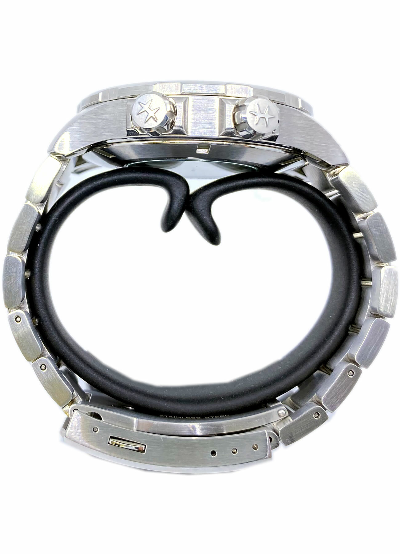 - This timepiece features a 45mm steel case paired with a high quality steel bracelet. It showcases a distinctive black dial and is powered by a precise automatic winding movement. The watch is designed with a water resistance of up to 100m.