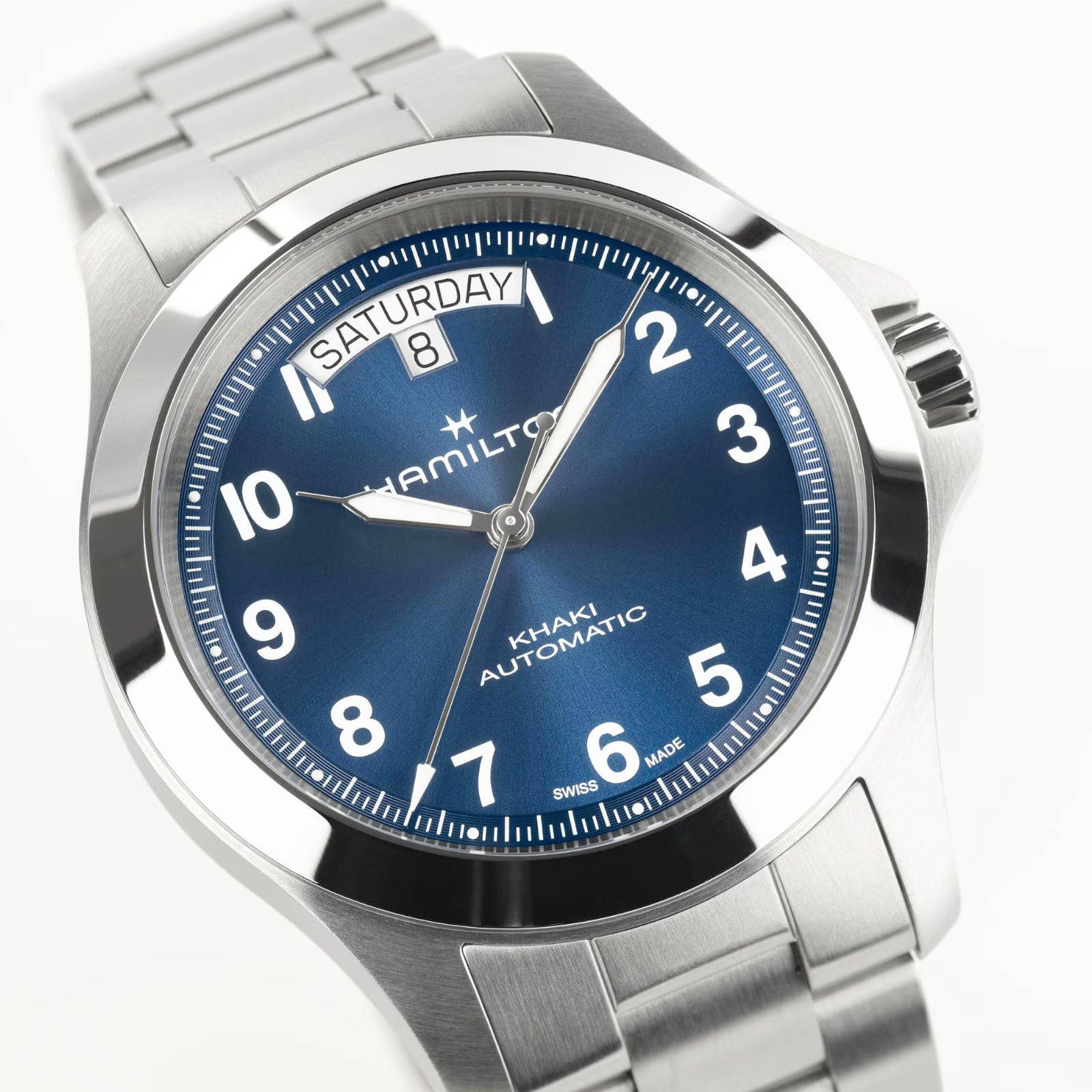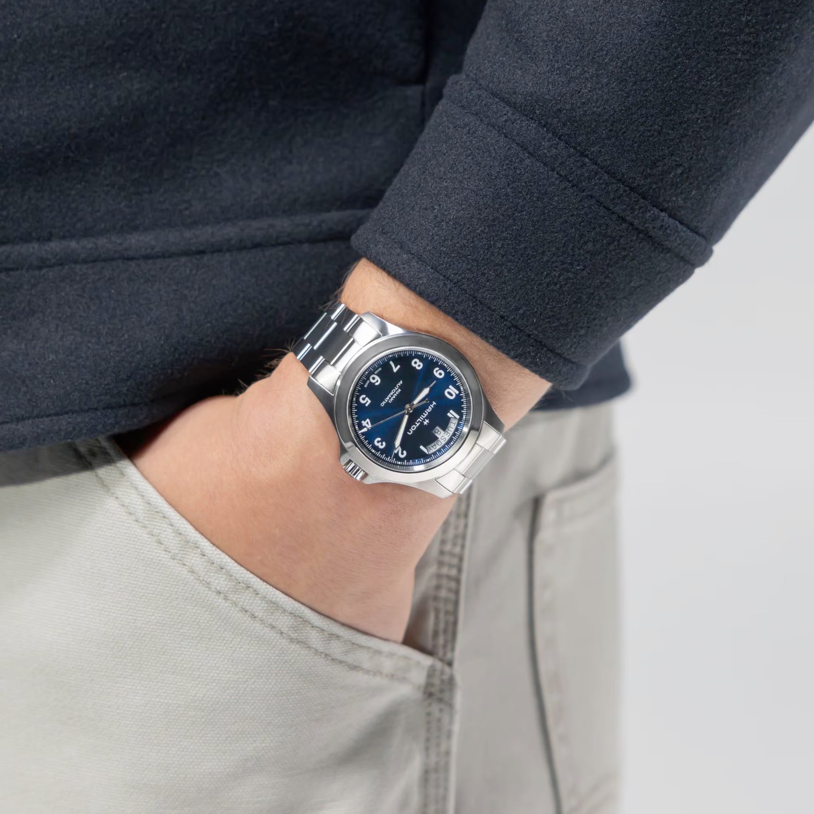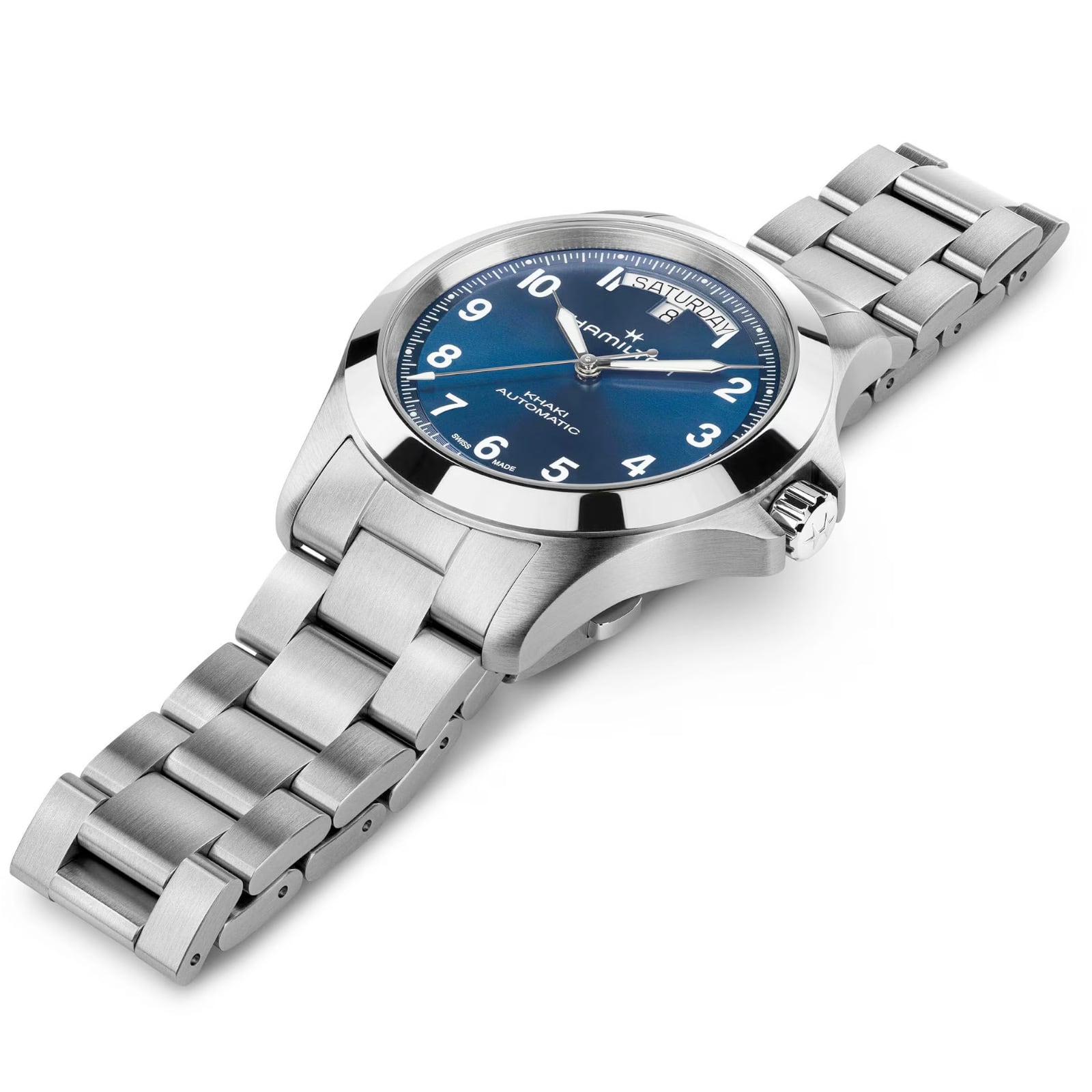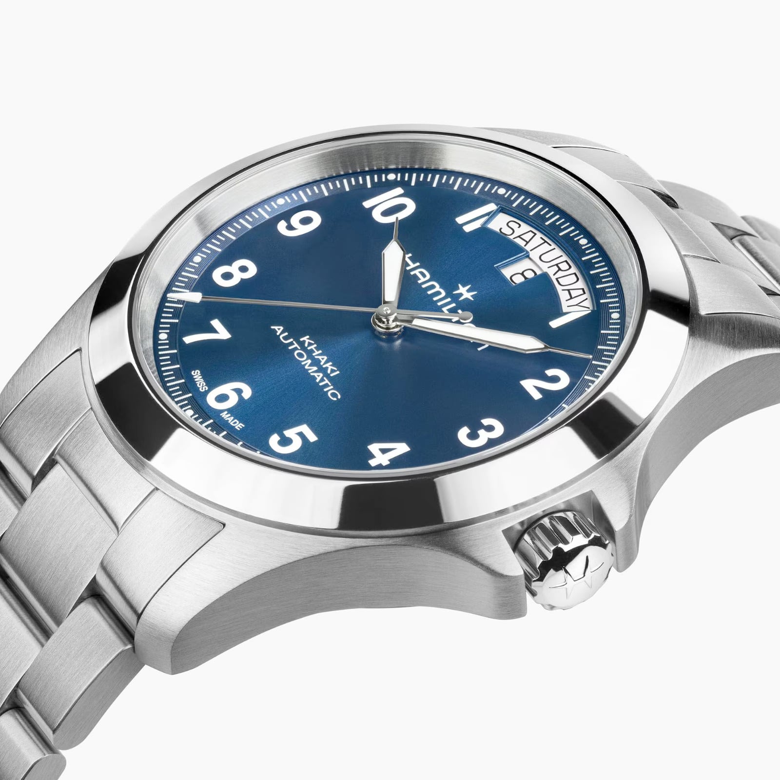Rugged yet refined, the Khaki Field King 40mm reimagines a military icon for life off duty. Its sun-brushed blue dial features bold Arabic numerals and a signature day-date display at 12 o’clock, framed by a brushed stainless steel case and bracelet with EasyClick adjustment. Upgraded to 10 bar water resistance and equipped with an anti-reflective sapphire crystal, this field watch delivers superior toughness and outdoor clarity in every condition. A modern classic built for leisure with heritage at its core.