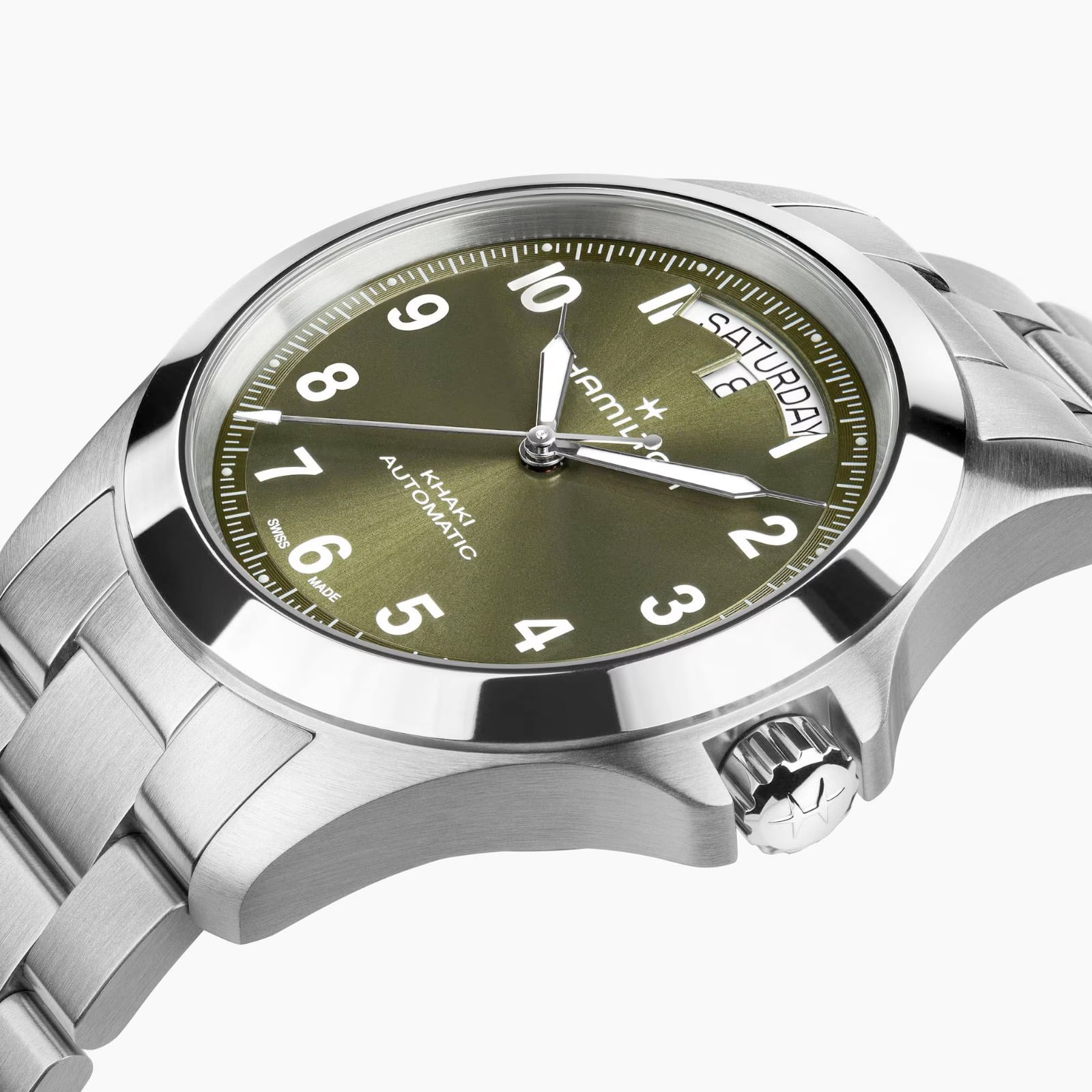 Rugged yet refined, the Khaki Field King 40mm reimagines a military icon for life off duty. Its sun-brushed blue dial features bold Arabic numerals and a signature day-date display at 12 o’clock, framed by a brushed stainless steel case and bracelet with EasyClick adjustment. Upgraded to 10 bar water resistance and equipped with an anti-reflective sapphire crystal, this field watch delivers superior toughness and outdoor clarity in every condition. A modern classic built for leisure with heritage at its core.