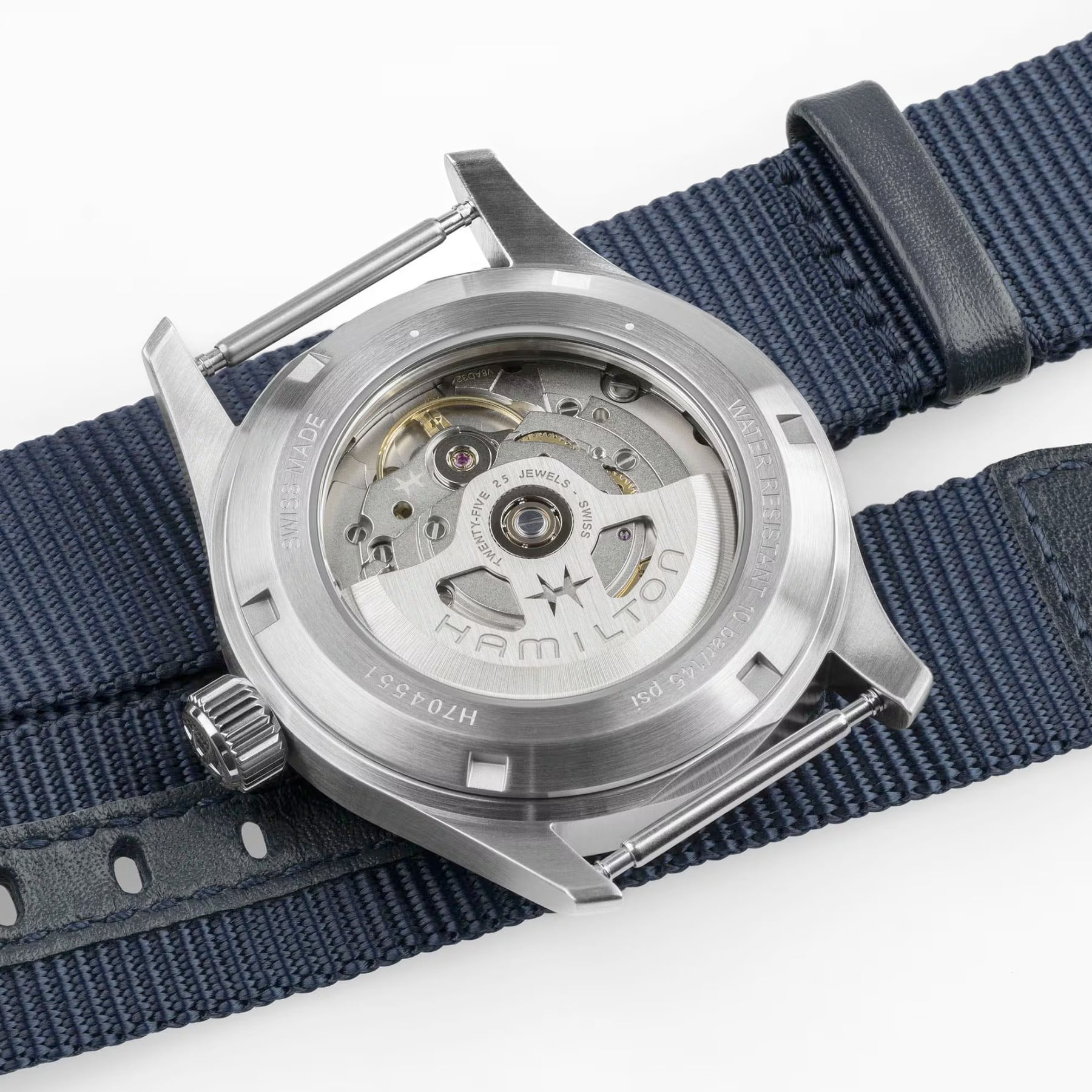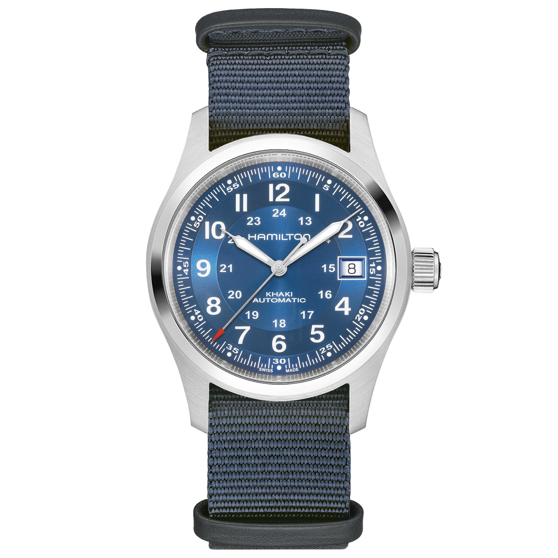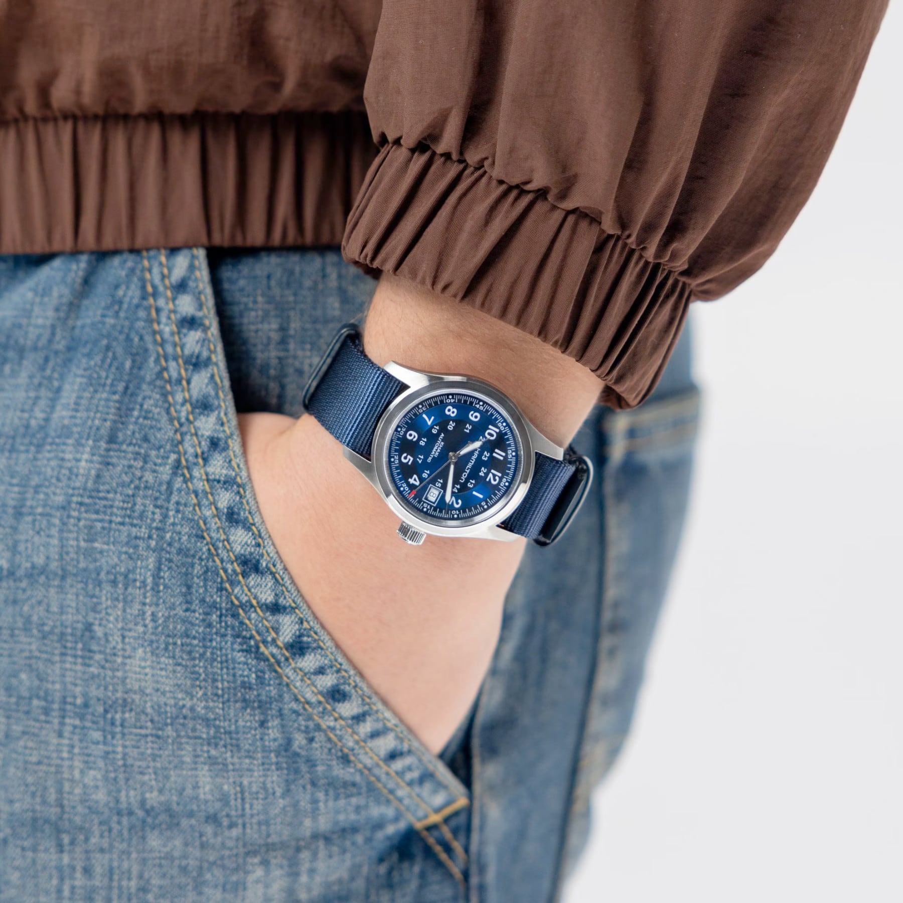 A faithful recreation of its original 1960s forebear, the Khaki Field Auto 38mm features our iconic H-10 automatic movement to deliver an 80-hour power reserve. Inspired by our military roots, this rugged, Swiss-made timepiece features a stainless steel case, blue dial with multi-textured finishings and Super-LumiNova®-coated hands for low-light visibility. A durable blue NATO strap reinforces its tactical edge, making it ready for action and any occassion.