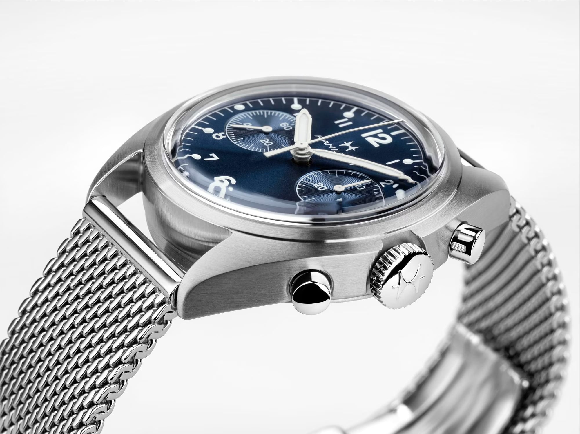 Rugged and reliable, the Khaki Pilot Pioneer Mechanical Chronograph pays homage to Hamilton's vintage military aviation watches. Powered by our exclusive hand-wound H-51-Si movement, this timepiece boasts a 60-hour power reserve and a stunning Aviation Blue dial with a sunray finish.