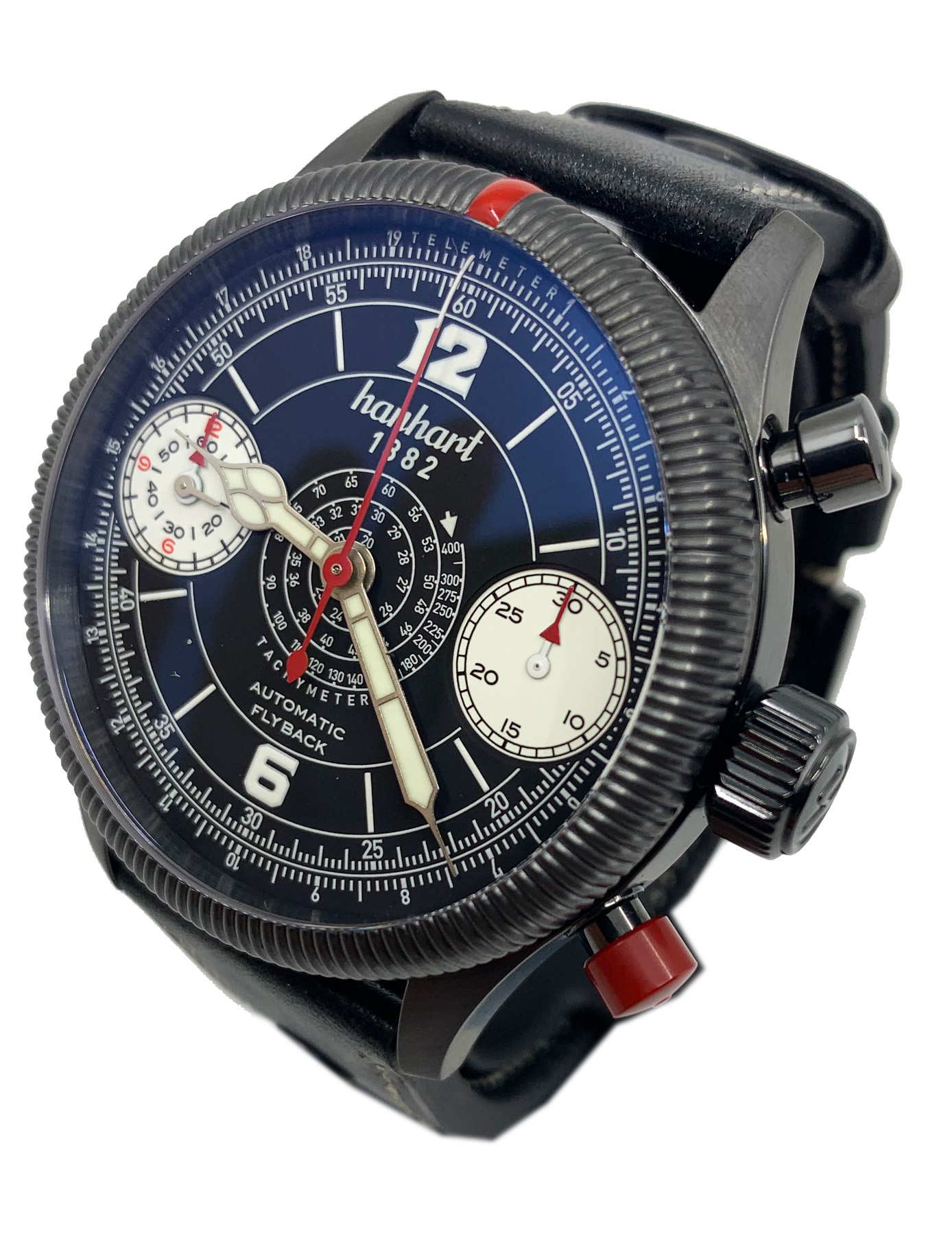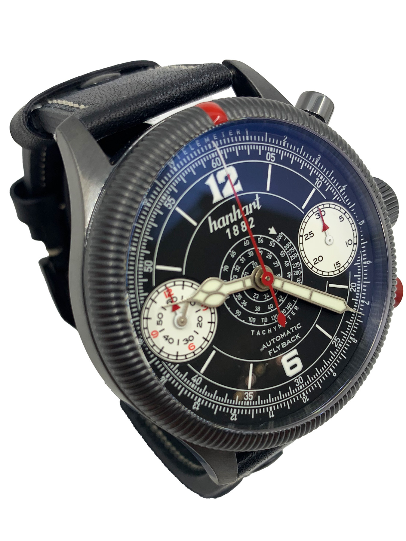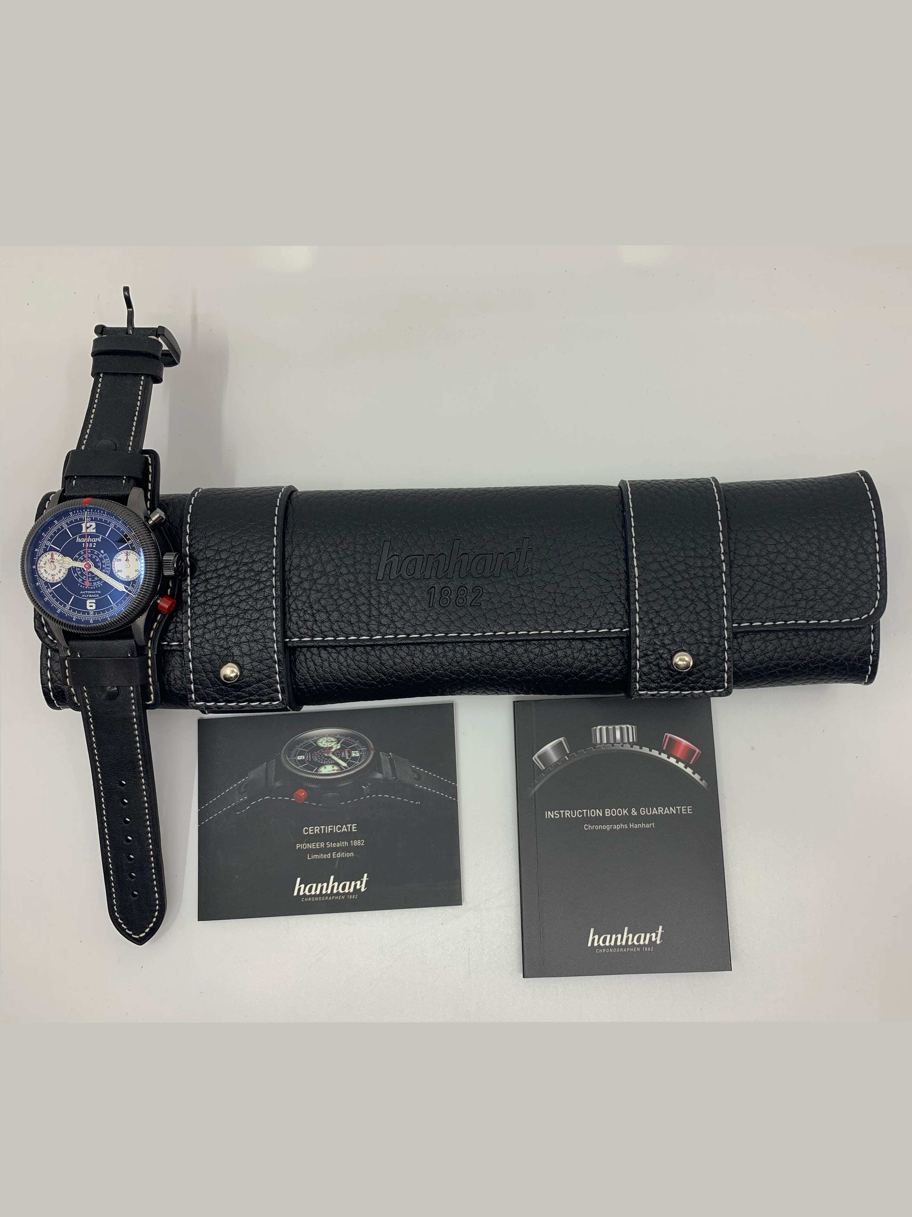 This Hanhart Pioneer Stealth 1882 Limited Edition is in UNWORN condition. It has boxes and papers. This watch has been fully authenticated and certified by Exquisite Timepieces.