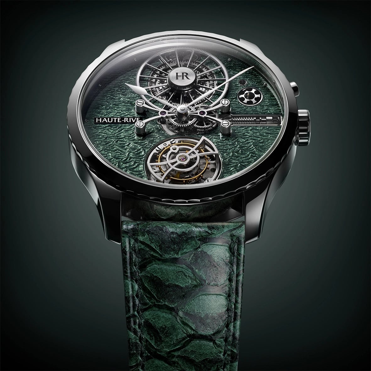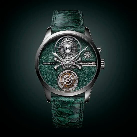Lagoverde is the most poetic and confidential expression of HONORIS I. Its 18K white gold case frames a dial of rare complexity: a solid gold base, hand-engraved with waves inspired by Lake Neuchâtel, then covered with a deep green translucent grand feu enamel. The engraving follows a carefully crafted perspective: the waves are larger and more prominent at 6 o’clock — around the tourbillon — and gradually become finer as they rise toward 12 o’clock, where the wheel of time sits. This visual transition echoes the depth and flow of time itself. The vibrant green enamel captures the shifting moods of the lake in stormy weather — raw, unpredictable, and deeply expressive. At the heart of the watch, the flying mystery tourbillon appears to float in space, powered by a patented in-house movement offering an extraordinary 1000-hour power reserve. Comprising 288 components, the caliber is entirely developed and assembled in Haute-Rive’s own workshops. Strictly limited to only 8 pieces worldwide, HONORIS I Lagoverde is made for collectors who seek artisan elegance, aesthetic depth, and mechanical distinction. The timepiece is paired with a hand-stitched green perch leather strap and a white gold pin buckle. Lagoverde reflects Haute-Rive’s philosophy: to elevate time through light, matter, and silence.