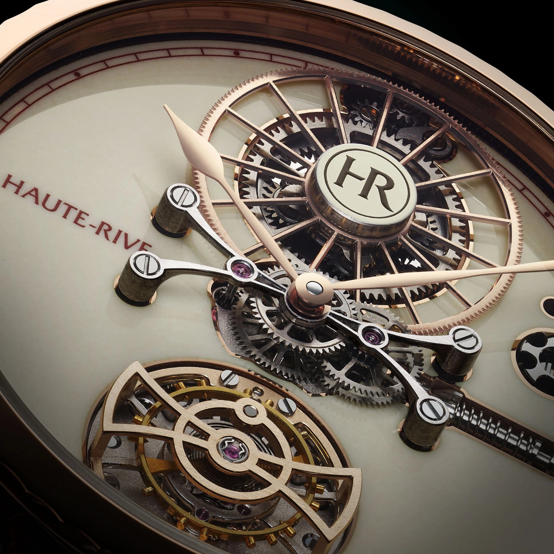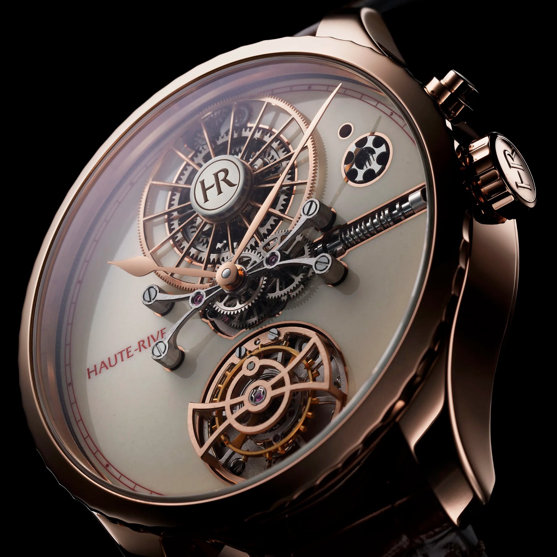 This refined version of HONORIS I pairs the warmth of an 18K rose gold case with the soft elegance of an eggshell-colored grand feu enamel dial. Discreet yet radiant, this shade enhances the purity of the design. At its center, the flying mystery tourbillon is driven by a patented in-house movement with a remarkable 1000-hour power reserve. The 288-component caliber reflects Haute-Rive’s uncompromising commitment to fine watchmaking. The watch is offered with a hand-stitched calfskin or alligator leather strap and a rose gold pin buckle. HONORIS I is a refined expression of Haute-Rive’s watchmaking philosophy.