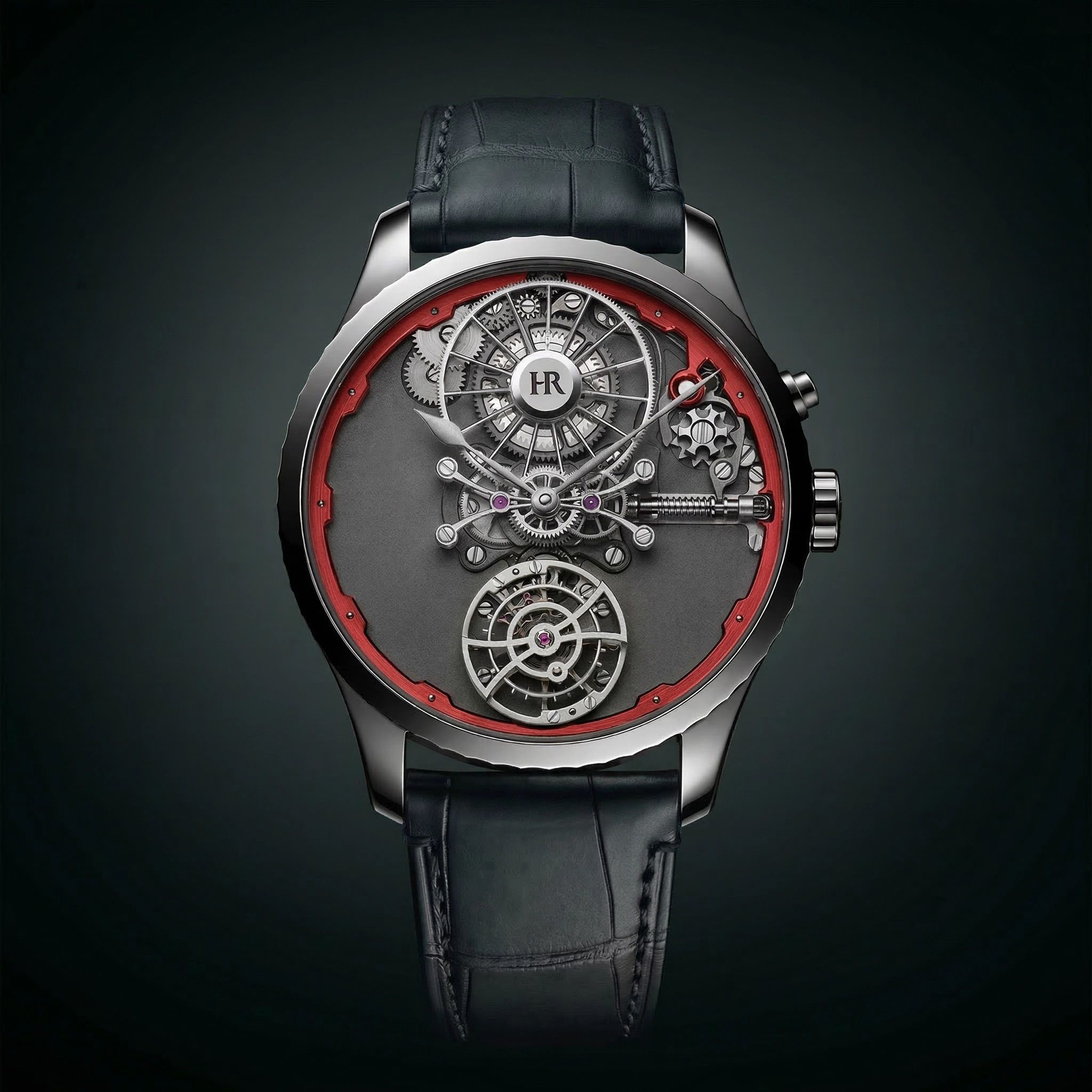 The Honoris Meccanica Rosso model represents the most architectural and mechanical expression of the Honoris line. Its 18-carat white gold case houses a deliberately open watchmaking construction, where the mechanics themselves become the central element of the design. In place of a traditional dial, a finely crafted peripheral ring carries the hour markers, revealing the full architecture of the movement. This refined composition creates an impression of depth and lightness, as if the mechanics were floating freely in space. At the center of the watch, around 6 o’clock, the mysterious flying tourbillon appears to evolve in suspension, revealing the slow and majestic rhythm of the movement. This mechanical staging allows the tension and energy of the calibre to be observed directly, each component contributing to the visual balance of the whole. At the heart of the watch beats a patented manufacture movement offering an exceptional 1000-hour power reserve, the technical signature of HAUTE-RIVE. Composed of 288 components, this calibre has been entirely conceived, developed, and assembled in the brand’s workshops. The Honoris Meccanica expresses a contemporary vision of haute horlogerie, where the mechanics are no longer concealed but fully revealed. The watch is fitted with a hand-stitched leather strap and a white gold pin buckle. Produced in very small numbers, Honoris Meccanica Rosso is intended for collectors who ppreciate the intrinsic beauty of mechanical watchmaking and the purity of horological architecture. It embodies the spirit of HAUTE-RIVE: revealing the mechanics of time with strength, precision, and elegance.