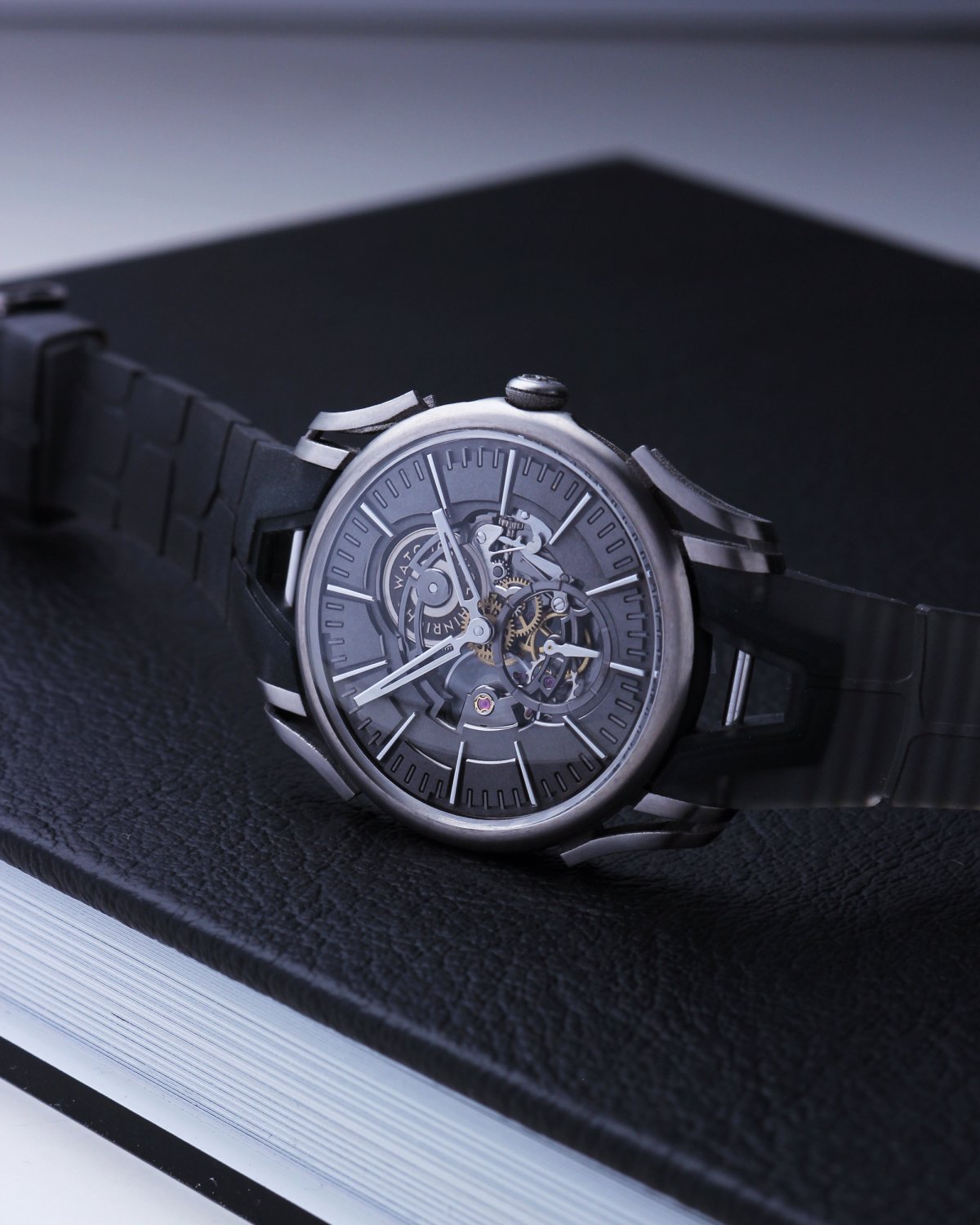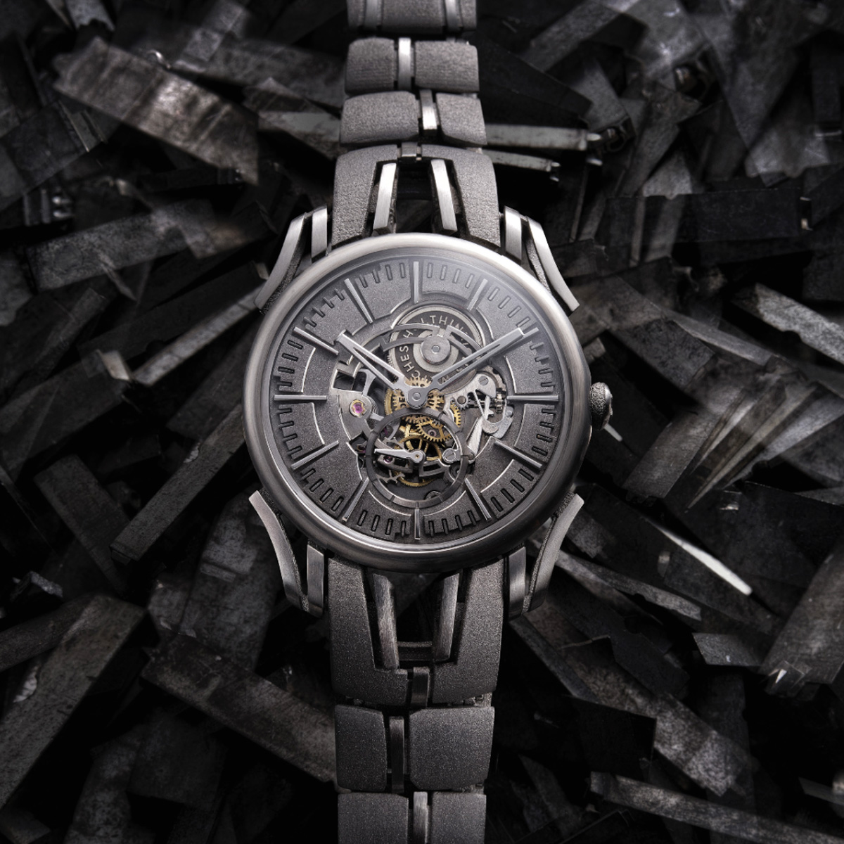 The Holthinrichs Deconstructed redefines wristwatch architecture through radical design and precision craftsmanship. Featuring an ultra-light 38.5 mm Grade-5 titanium monocoque case produced via 3D printing, its suspended, open-worked lugs and contrasting raw and brushed textures blur the line between engineering and art. The multi-layered skeleton dial—composed of 25 meticulously finished parts—reveals the in-house HW-M01 movement with hand-bevelled components and an inertia balance. Completing the vision are a 3D-printed titanium bracelet with a quick-release mechanism, or an integrated rubber strap, both engineered for comfort and expression.