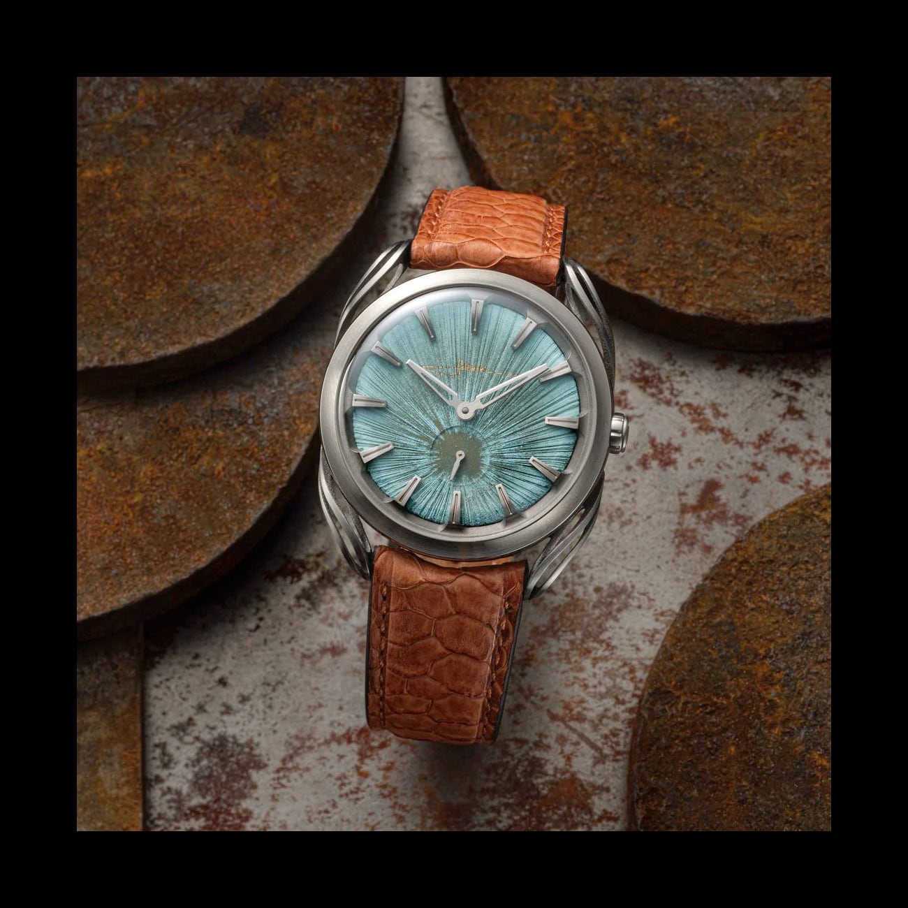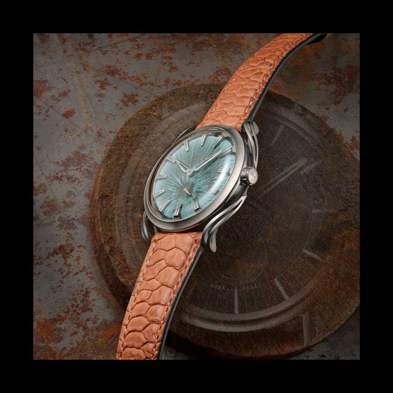 The LAB Series 1.S pairs a 3D-printed titanium grade 5 case with a brass dial finished in copper-oxide patina, its expressive sunburst pattern radiating outward from the sub-second aperture. At 38.5 mm wide and just 7.8 mm thick, it wears like a dress watch with an industrial edge — selectively hand-finished brushing set against raw and polished titanium surfaces. Inside, a top-grade Sellita SW360 runs beneath Holthinrichs' own hand-carved, heat-treated rotor. Limited to 100 pieces.