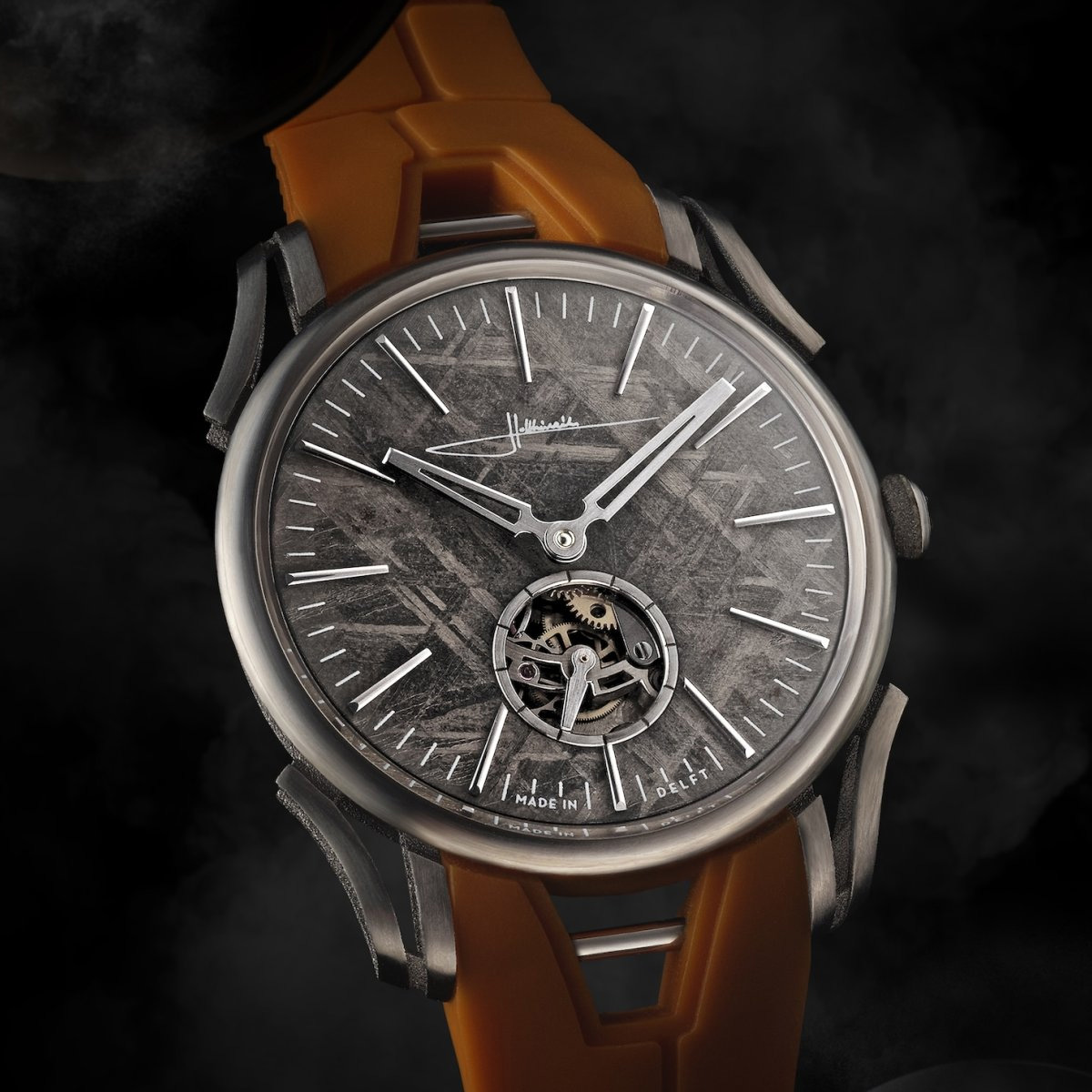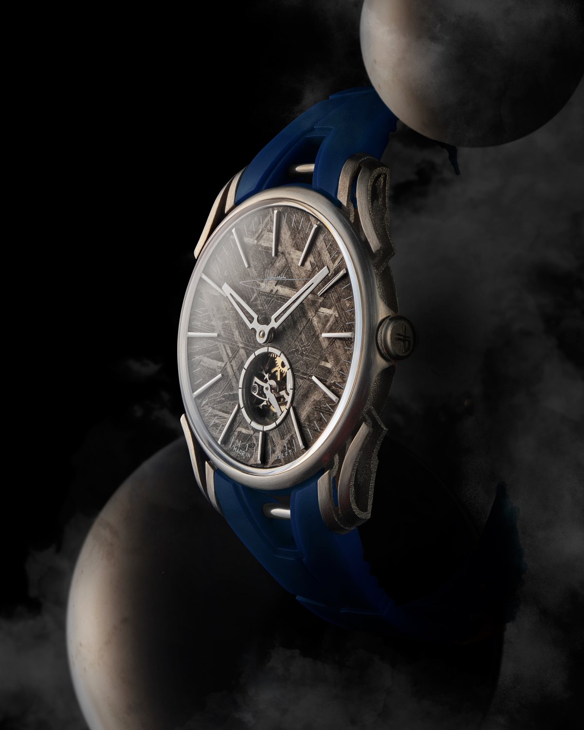 The Holthinrichs Meteorite watch bursts in from outer space with a raw, sporty interpretation of haute horology. Built around the Deconstructed (“DECON”) aesthetic, it features an ultralight skeletonized monocoque case crafted via 3D printing—delicate yet robust, the case weighs just 20 grams (without the strap) and showcases raw textures alongside finely brushed details. Its dial is cut from Muonionalusta meteorite, the oldest known to have struck Earth, revealing the mesmerizing Widmanstätten pattern that echoes cosmic origins. Completing the design are slim baton indices guiding the gaze inward, an openworked small-seconds subdial that hints at the movement’s kinetic energy, and a bespoke integrated PU rubber strap—potentially in semi-translucent tones—that mirrors the avant-garde spirit of “Horlogerie Brut,” where technology and craftsmanship collide.