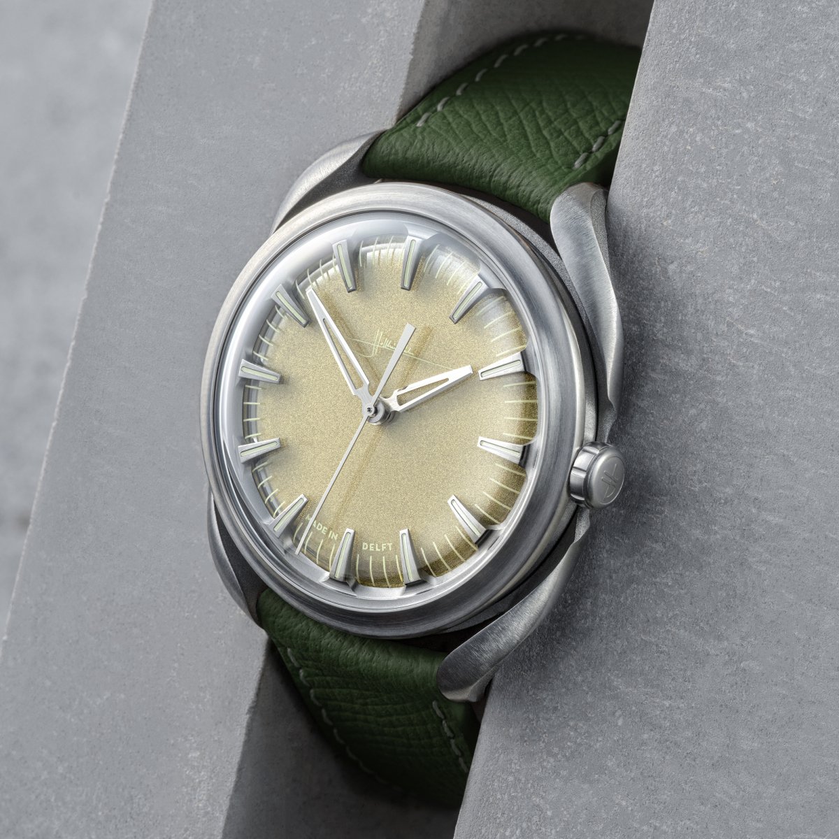 The Holthinrichs Signature Ornament with a 14K yellow gold multi-layered dial blends sculptural design and architectural elegance. Housed in a 38.5 mm grade 5 titanium case with dramatically curved lugs and raw-meets-brushed textures, its floating dial layers create striking optical depth: a frosted metal base, a domed sapphire layer with printed logo and indices, and a cantilevered marker ring with Super-LumiNova. Powered by a modified Sellita SW-300 and finished with an Art-Nouveau inspired rotor, it’s a refined classic with modern flair.